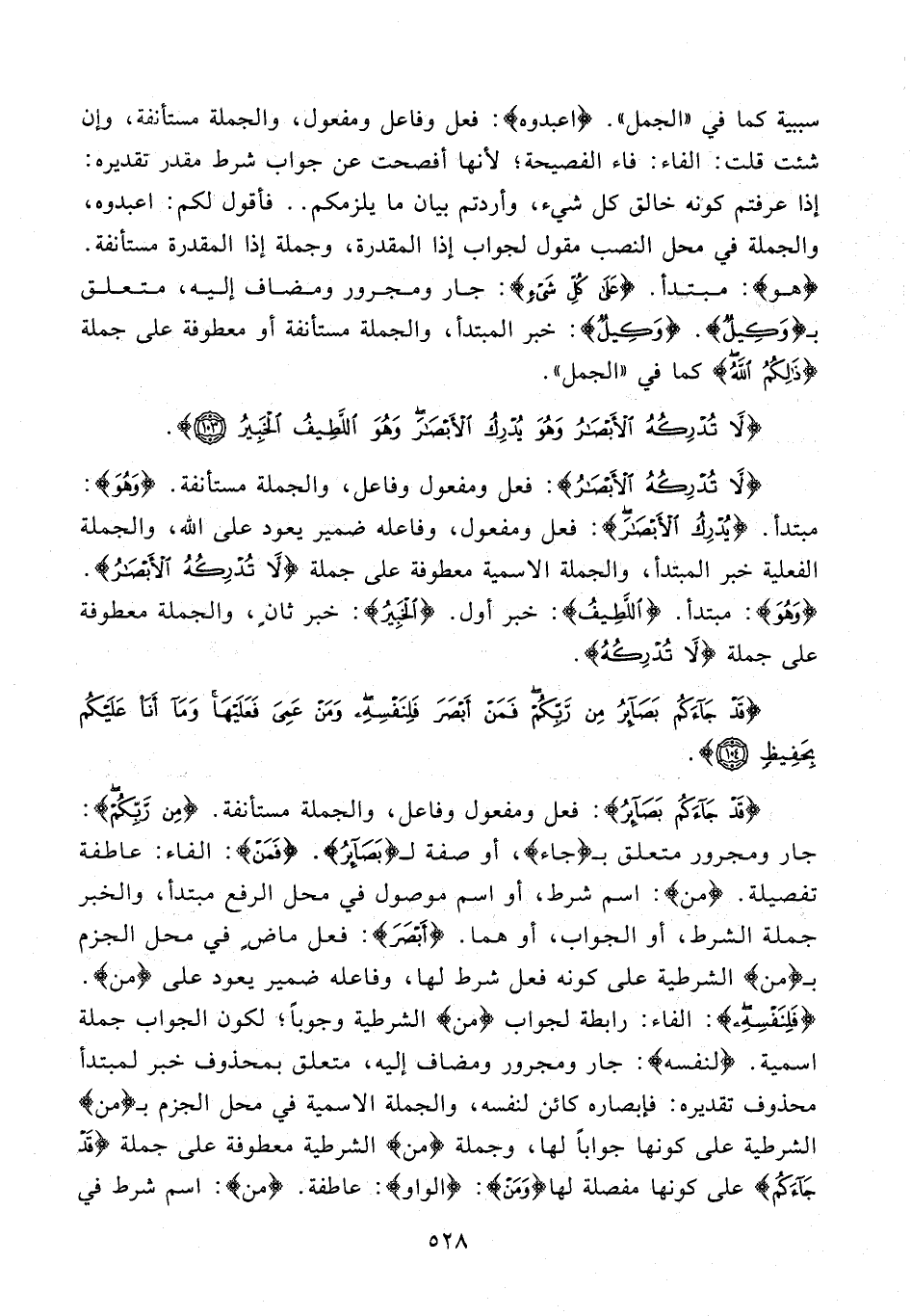 {لَا تُدْرِكُهُ الْأَبْصَارُ}: فعل ومفعول وفاعل، والجملة مستأنفة. {وَهُوَ}: مبتدأ. {يُدْرِكُ الْأَبْصَارَ}: فعل ومفعول، وفاعله ضمير يعود على الله، والجملة الفعلية خبر المبتدأ، والجملة الإسمية معطوفة على جملة {لَا تُدْرِكُهُ الْأَبْصَارُ}. {وَهُوَ}: مبتدأ. {اللَّطِيفُ}: خبر أول. {الْخَبِيرُ}: خبر ثانٍ، والجملة معطوفة على جملة {لَا تُدْرِكُهُ}.