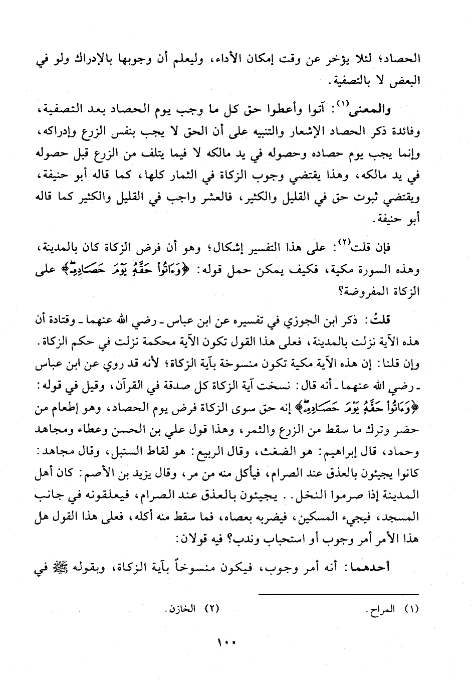 قلت: ذكر ابن الجوزي في تفسيره عن ابن عباس - رضي الله عنهما - وقتادة أن هذه الآية نزلت بالمدينة، فعلى هذا القول تكون الآية محكمة نزلت في حكم الزكاة. وإن قلنا: إن هذه الآية مكية تكون منسوخة بآية الزكاة؛ لأنه قد روي عن ابن عباس - رضي الله عنهما - أنه قال: نسخت آية الزكاة كل صدقة في القرآن، وقيل في قوله: {وَآتُوا حَقَّهُ يَوْمَ حَصادِهِ} إنه حق سوى الزكاة فرض يوم الحصاد، وهو إطعام من حضر وترك ما سقط من الزرع والثمر، وهذا قول علي بن الحسن وعطاء ومجاهد وحماد، قال إبراهيم: هو الضغث، وقال الربيع: هو لقاط السنبل، وقال مجاهد: كانوا يجيئون بالعذق عند الصرام، فيأكل منه من مر، وقال يزيد بن الأصم: كان أهل المدينة إذا صرموا النخل .. يجيئون بالعذق عند الصرام، فيعلقونه في جانب المسجد، فيجيء المسكين، فيضربه بعصاه، فما سقط منه أكله، فعلى هذا القول هل هذا الأمر أمر وجوب أو استحباب وندب؟ فيه قولان: أحدهما: أنه أمر وجوب، فيكون منسوخا بآية الزكاة، وبقوله صلى الله عليه وسلم في