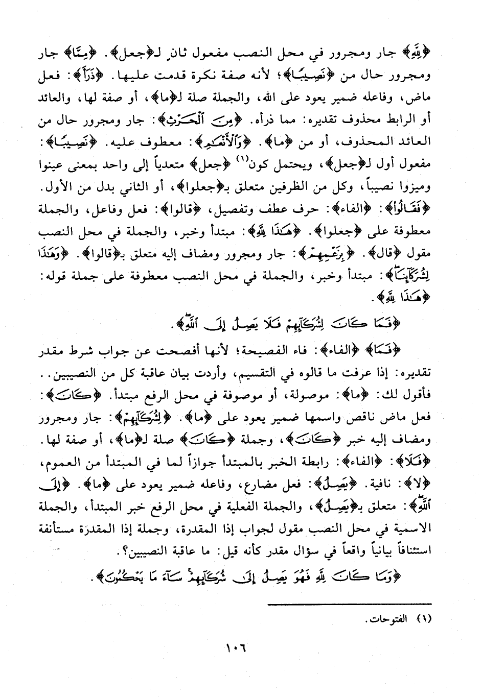 {لِلَّهِ} جار ومجرور في محل النصب مفعول ثان لـ {جعل}. {مِمَّا} جار ومجرور حال من {نَصِيبًا}؛ لأنه صفة نكرة قدمت عليها. {ذَرَأَ}: فعل ماض، وفاعله ضمير يعود على الله، والجملة صلة لـ {ما}، أو صفة لها، والعائد أو الرابط محذوف تقديره: مما ذرأه. {مِنَ الْحَرْثِ}: جار ومجرور حال من العائد المحذوف، أو من {ما}. وَالْأَنْعامِ: معطوف عليه. نَصِيبًا: مفعول أول لـ {جعل}، ويحتمل كون (¬1) {جعل} متعديا إلى واحد بمعنى عينوا وميزوا نصيبا، وكل من الظرفين متعلق بـ {جَعَلُوا}، أو الثاني بدل من الأول. فَقالُوا: {الفاء}: حرف عطف وتفصيل، {قالوا}: فعل وفاعل، والجملة معطوفة على جَعَلُوا. {هذا لِلَّهِ}: مبتدأ وخبر، والجملة في محل النصب مقول {قال}. {بِزَعْمِهِمْ}: جار ومجرور ومضاف إليه متعلق بـ {فَقالُوا}. {وَهذا لِشُرَكائِنا}: مبتدأ وخبر، والجملة في محل النصب معطوفة على جملة قوله: {هذا لِلَّهِ}.