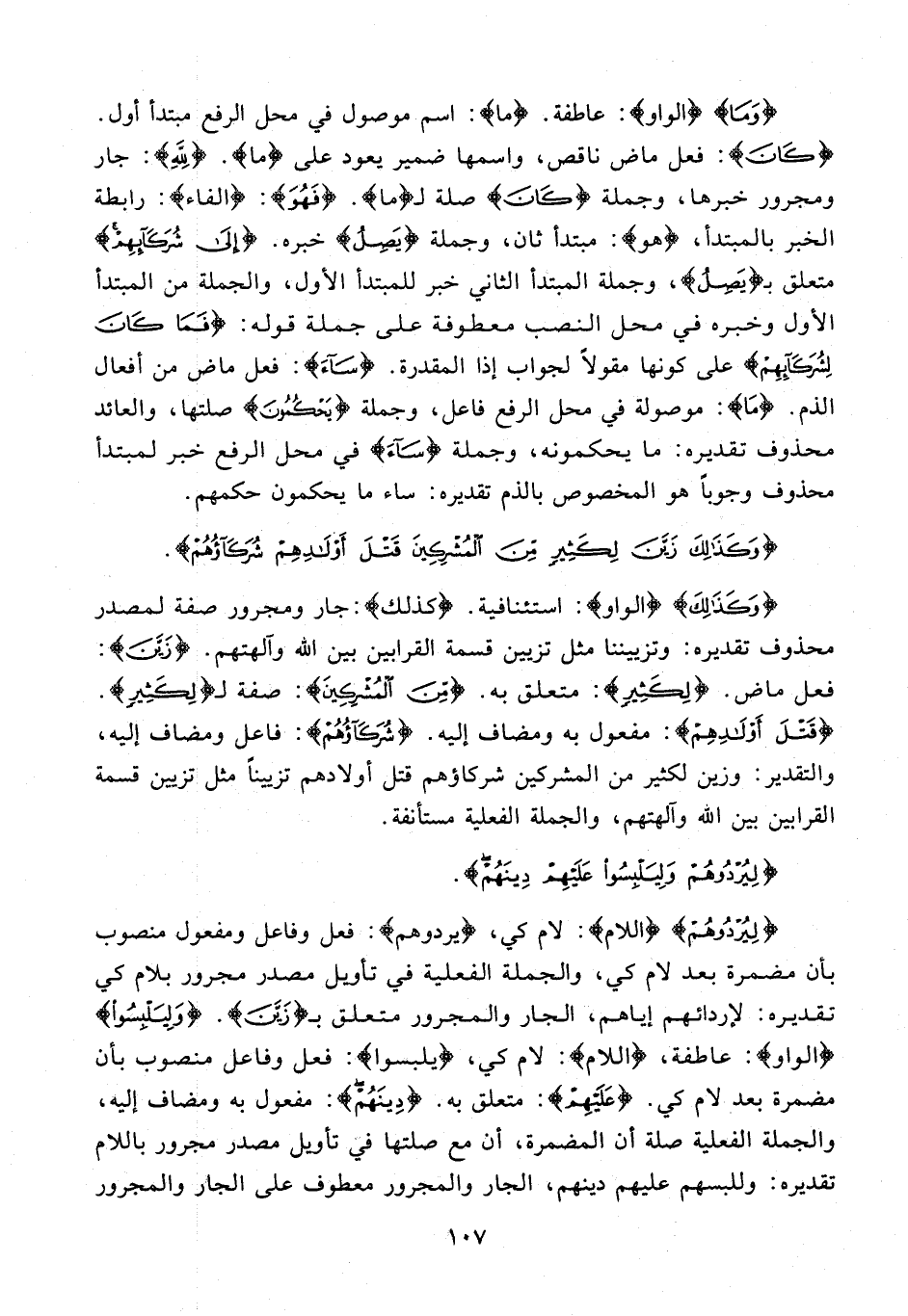 قَتْلَ أَوْلادِهِمْ: مفعول به ومضاف إليه. شُرَكاؤُهُمْ: فاعل ومضاف إليه، والتقدير: وزين لكثير من المشركين شركاؤهم قتل أولادهم تزيينا مثل تزيين قسمة القرابين بين الله وآلهتهم، والجملة الفعلية مستأنفة.