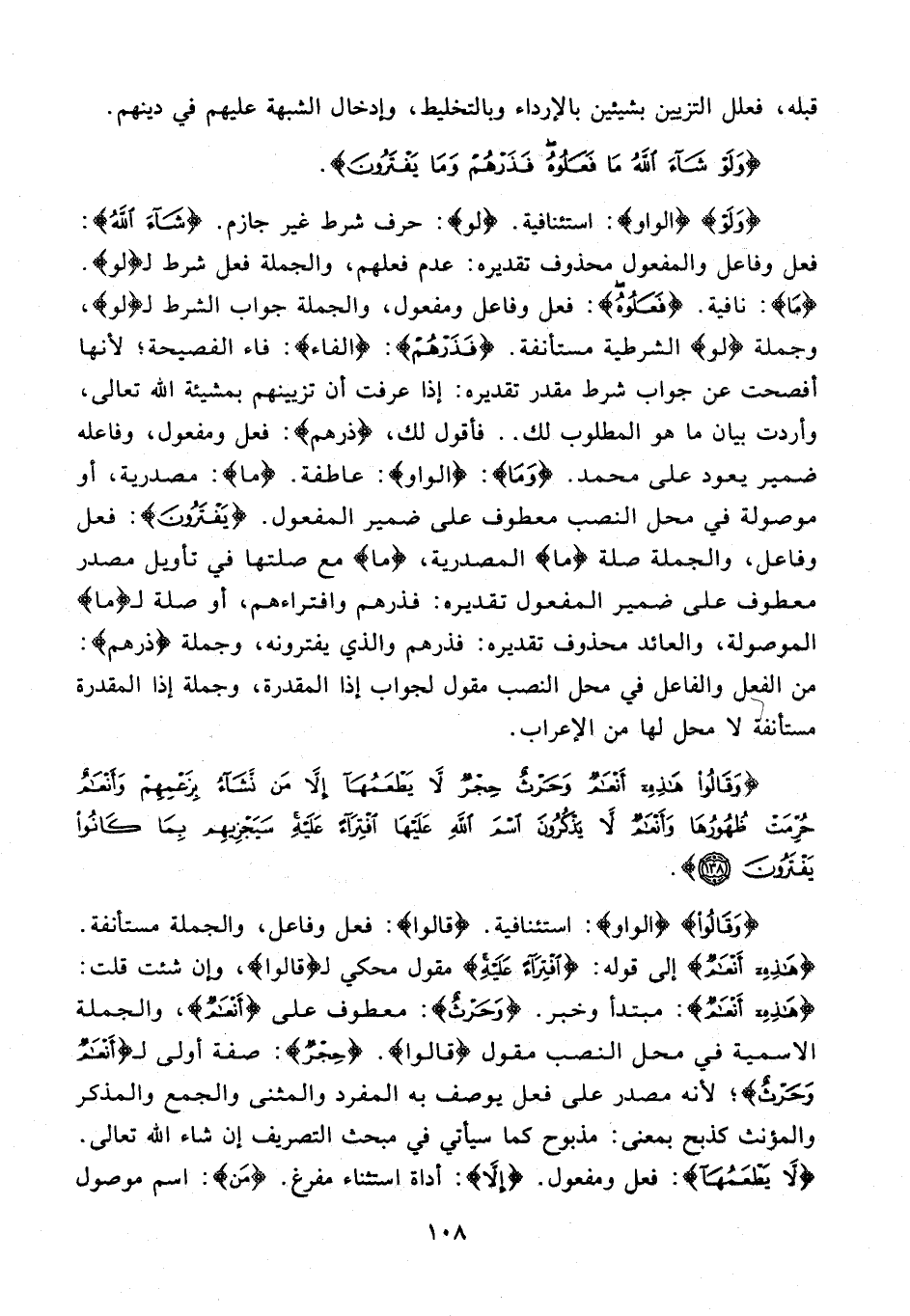 {وَلَوْ} {الواو}: استئنافية. {لَوْ}: حرف شرط غير جازم. {شاءَ اللَّهُ}: فعل وفاعل والمفعول محذوف تقديره: عدم فعلهم، والجملة فعل شرط لـ {لَوْ}. {ما}: نافية. {فَعَلُوهُ}: فعل وفاعل ومفعول، والجملة جواب الشرط لـ {لَوْ}، وجملة {لَوْ} الشرطية مستأنفة. {فَذَرْهُمْ}: {الفاء}: فاء الفصيحة؛ لأنها أفصحت عن جواب شرط مقدر تقديره: إذا عرفت أن تزيينهم بمشيئة الله تعالى، وأردت بيان ما هو المطلوب لك .. فأقول لك، {ذرهم}: فعل ومفعول، وفاعله ضمير يعود على محمد. {وَما}: {الواو}: عاطفة. {ما}: مصدرية، أو موصولة في محل النصب معطوف على ضمير المفعول. {يَفْتَرُونَ}: فعل وفاعل، والجملة صلة {ما} المصدرية، {ما} مع صلتها في تأويل مصدر معطوف على ضمير المفعول تقديره: فذرهم وافتراءهم، أو صلة لـ {ما} الموصولة، والعائد محذوف تقديره: فذرهم والذي يفترونه، وجملة {ذرهم}: من الفعل والفاعل في محل النصب مقول لجواب إذا المقدرة، وجملة إذا المقدرة مستأنفة لا محل لها من الإعراب.