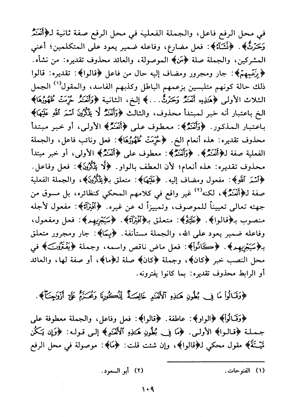 في محل الرفع فاعل، والجملة الفعلية في محل الرفع صفة ثانية لـ {أَنْعامٌ وَحَرْثٌ}. {نَشاءُ}: فعل مضارع، وفاعله ضمير يعود على المتكلمين؛ أعني المشركين، والجملة صلة {مَنْ} الموصولة، والعائد محذوف تقديره: من نشأه. {بِزَعْمِهِمْ}: جار ومجرور ومضاف إليه حال من فاعل {قالُوا}: تقديره: قالوا ذلك حالة كونهم متلبسين بزعمهم الباطل وكذبهم الفاسد، والمقول (¬1) الجمل الثلاث الأولى {هذِهِ أَنْعامٌ وَحَرْثٌ ...} إلخ، الثانية {وَأَنْعامٌ حُرِّمَتْ ظُهُورُها} الخ باعتبار أنه خبر لمبتدأ محذوف، والثالث {وَأَنْعامٌ لا يَذْكُرُونَ اسْمَ اللَّهِ عَلَيْهَا} باعتبار المذكور. {وَأَنْعامٌ}: معطوف على {أَنْعامٌ} الأولى، أو خبر مبتدأ محذوف تقديره: هذه أنعام الخ. {حُرِّمَتْ ظُهُورُها:} فعل ونائب فاعل، والجملة الفعلية صفة لـ {أَنْعامٌ}. {وَأَنْعامٌ}: معطوف على {أَنْعامٌ} الأولى، أو خبر مبتدأ محذوف تقديره: هذه أنعام؛ لأن العطف بالواو. {لا يَذْكُرُونَ}: فعل وفاعل. {اسْمَ اللَّهِ}: مفعول ومضاف إليه. {عَلَيْهَا}: متعلق بـ {يَذْكُرُونَ}، والجملة الفعلية صفة لـ {أَنْعامٌ}، لكنه (¬2) غير واقع في كلامهم المحكي كنظائره، بل مسوق من جهته تعالى تعيينا للموصوف، وتمييزا له عن غيره. {افْتِراءً}: مفعول لأجله منصوب بـ قالُوا. {عَلَيْهِ}: متعلق بـ {افْتِراءً}. {سَيَجْزِيهِمْ}: فعل ومفعول، وفاعله ضمير يعود على الله، والجملة مستأنفة. {بِما}: جار ومجرور متعلق بـ {سَيَجْزِيهِمْ}. {كانُوا}: فعل ماض ناقص واسمه، وجملة {يَفْتَرُونَ} في محل النصب خبر {كان}، وجملة {كان} صلة لـ {ما}، أو صفة لها، والعائد أو الرابط محذوف تقديره: بما كانوا يفترونه.
