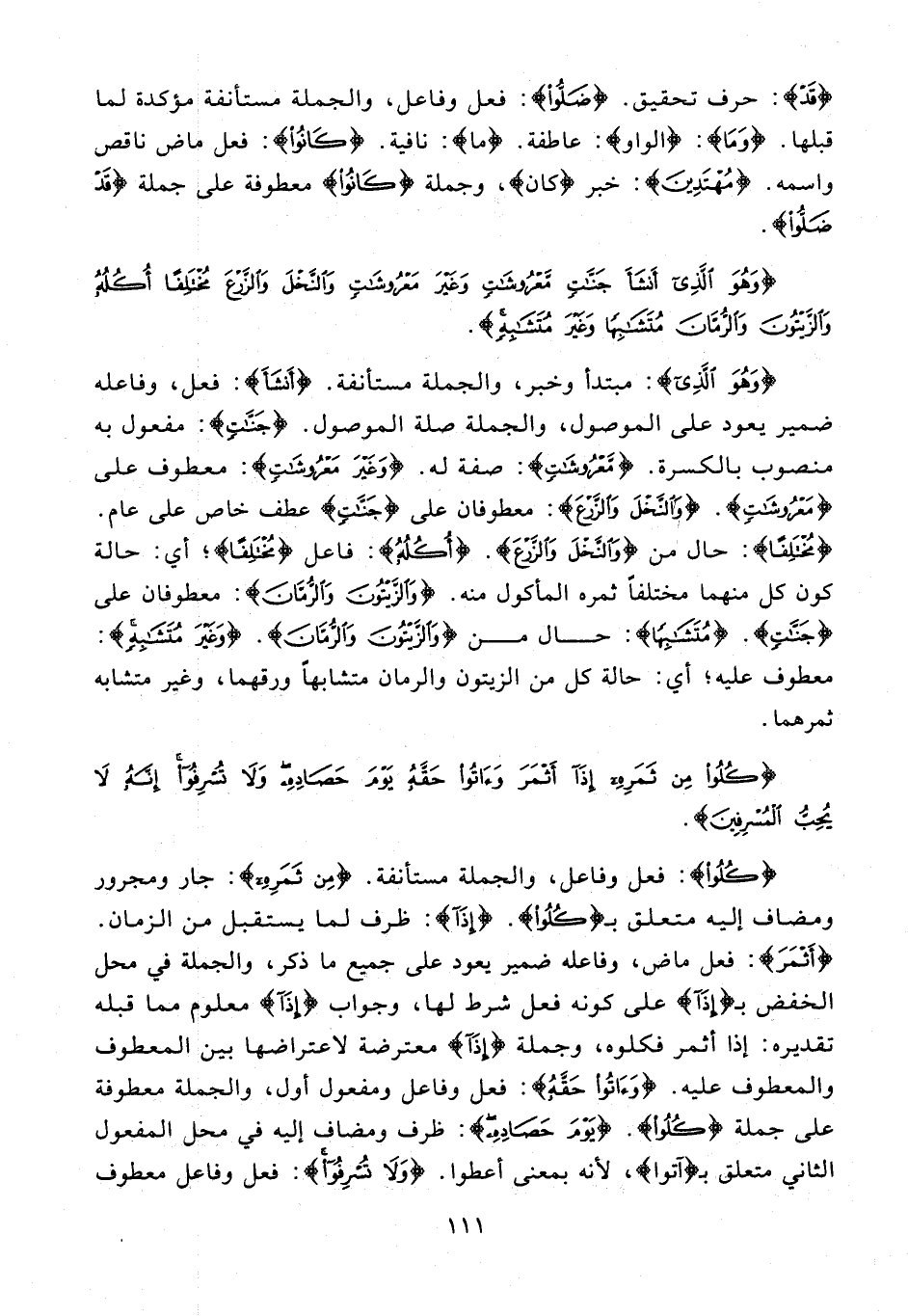 {وَهُوَ الَّذِي}: مبتدأ وخبر، والجملة مستأنفة. {أَنْشَأَ}: فعل، وفاعله ضمير يعود على الموصول، والجملة صلة الموصول. {جَنَّاتٍ}: مفعول به منصوب بالكسرة. {مَعْرُوشاتٍ}: صفة له. {وَغَيْرَ مَعْرُوشاتٍ}: معطوف على {مَعْرُوشاتٍ}. {وَالنَّخْلَ وَالزَّرْعَ}: معطوفان على {جَنَّاتٍ} عطف خاص على عام. {مُخْتَلِفًا}: حال من {وَالنَّخْلَ وَالزَّرْعَ}. {أُكُلُهُ}: فاعل {مُخْتَلِفًا}؛ أي: حالة كون كل منهما مختلفا ثمره المأكول منه. {وَالزَّيْتُونَ وَالرُّمَّانَ}: معطوفان على {جَنَّاتٍ}. {مُتَشابِهًا}: حال من {وَالزَّيْتُونَ وَالرُّمَّانَ}. {وَغَيْرَ مُتَشابِهٍ}: معطوف عليه؛ أي: حالة كل من الزيتون والرمان متشابها ورقهما، وغير متشابه ثمرهما.