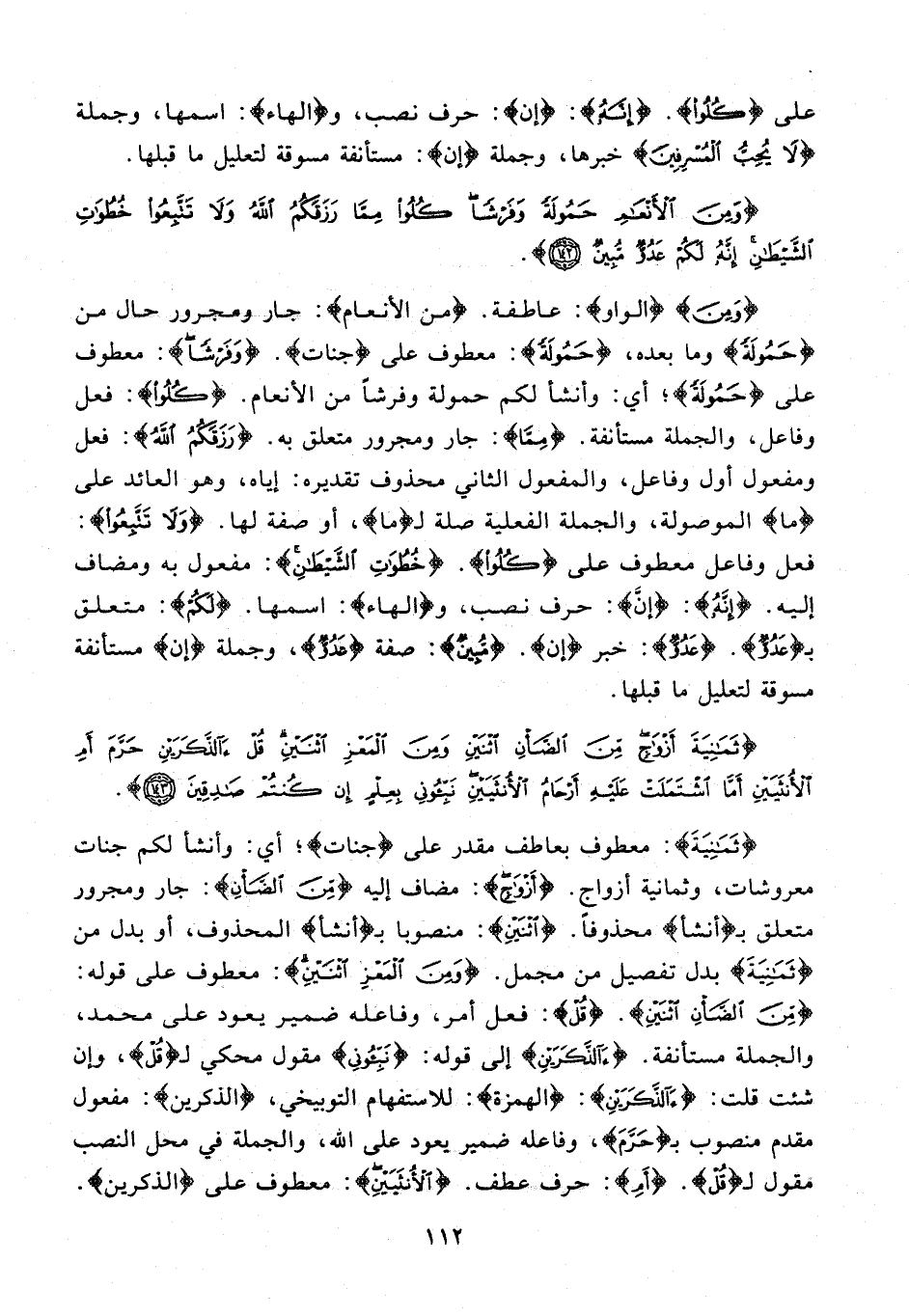 {وَمِنَ} {الواو}: عاطفة. {مِنَ الْأَنْعامِ}: جار ومجرور حال من {حَمُولَةً} وما بعده، {حَمُولَةً}: معطوف على {جَنَّاتٍ}. {وَفَرْشًا}: معطوف على {حَمُولَةً}؛ أي: وأنشأ لكم حمولة وفرشا من الأنعام. {كُلُوا}: فعل وفاعل، والجملة مستأنفة. {مِمَّا}: جار ومجرور متعلق به. {رَزَقَكُمُ اللَّهُ}: فعل ومفعول أول وفاعل، والمفعول الثاني محذوف تقديره: إياه، وهو العائد على {ما} الموصولة، والجملة الفعلية صلة لـ {ما}، أو صفة لها. {وَلا تَتَّبِعُوا}: فعل وفاعل معطوف على {كُلُوا}. {خُطُواتِ الشَّيْطانِ}: مفعول به ومضاف إليه. {إِنَّهُ}: {إنّ}: حرف نصب، و {الهاء}: اسمها. {لَكُمْ}: متعلق بـ {عَدُوٌّ}. عَدُوٌّ: خبر {إن}. {مُبِينٌ}: صفة {عَدُوٌّ}، وجملة {إن} مستأنفة مسوقة لتعليل ما قبلها.