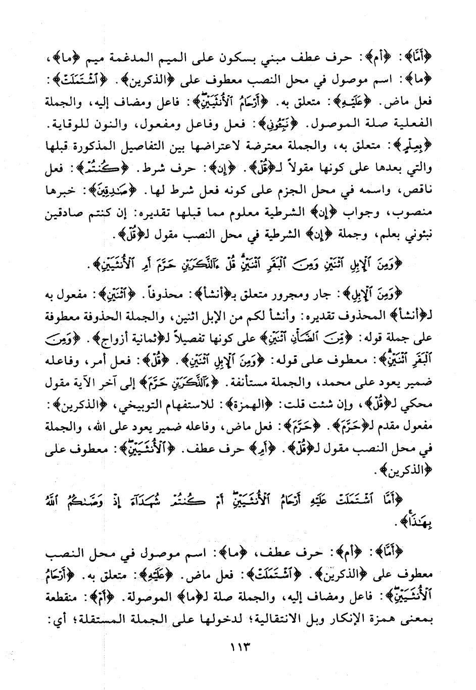 {وَمِنَ الْإِبِلِ}: جار ومجرور متعلق بـ {أَنْشَأَ}: محذوفا. {اثْنَيْنِ}: مفعول به لـ {أَنْشَأَ} المحذوف تقديره: وأنشأ لكم من الإبل اثنين، والجملة الحذوفة معطوفة على جملة قوله: {مِنَ الضَّأْنِ اثْنَيْنِ} على كونها تفصيلا لـ {ثَمانِيَةَ أَزْواجٍ}. {وَمِنَ الْبَقَرِ اثْنَيْنِ}: معطوف على قوله: {وَمِنَ الْإِبِلِ اثْنَيْنِ}. {قُلْ}: فعل أمر، وفاعله ضمير يعود على محمد، والجملة مستأنفة. {آلذَّكَرَيْنِ حَرَّمَ} إلى آخر الآية مقول محكي لـ {قُلْ}، وإن شئت قلت: (الهمزة): للاستفهام التوبيخي، {الذكرين}: مفعول مقدم لـ {حَرَّمَ}. {حَرَّمَ}: فعل ماض، وفاعله ضمير يعود على الله، والجملة في محل النصب مقول لـ {قُلْ}. {أَمِ} حرف عطف. {الْأُنْثَيَيْنِ}: معطوف على {الذكرين}.