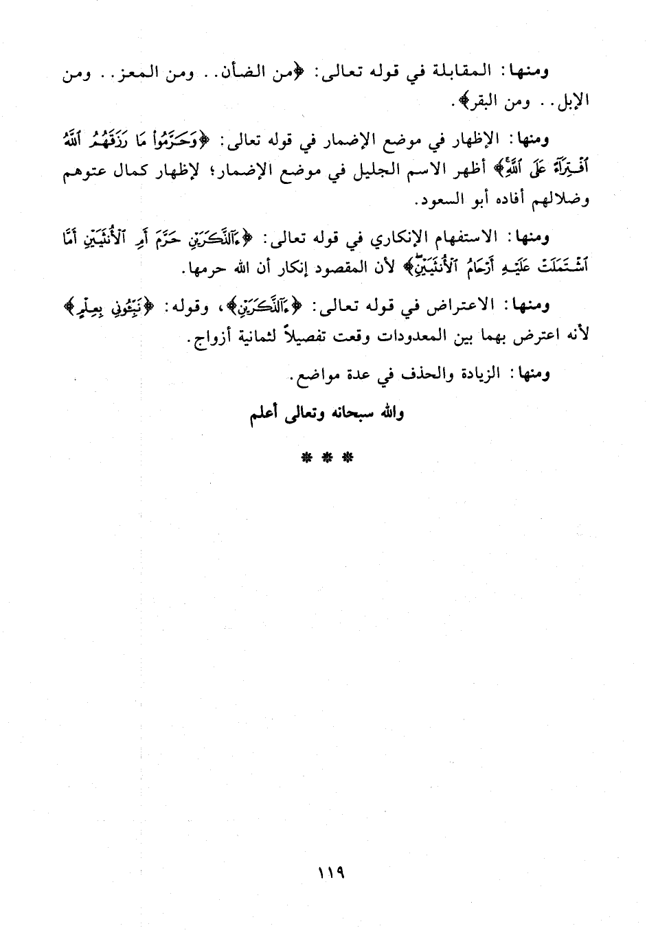 ومنها: الاستفهام الإنكاري في قوله تعالى: {آلذَّكَرَيْنِ حَرَّمَ أَمِ الْأُنْثَيَيْنِ أَمَّا اشْتَمَلَتْ عَلَيْهِ أَرْحامُ الْأُنْثَيَيْنِ} لأن المقصود إنكار أن الله حرمها.