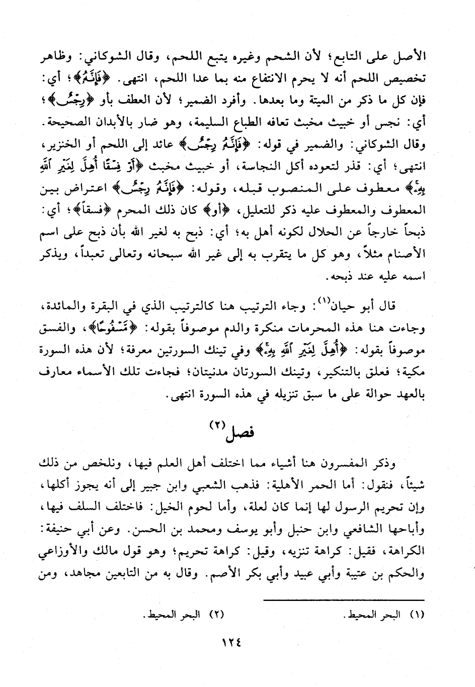 قال أبو حيان (¬1): وجاء الترتيب هنا كالترتيب الذي في البقرة والمائدة، وجاءت هنا هذه المحرمات منكرة والدم موصوفا بقوله: {مَسْفُوحًا}، والفسق موصوفا بقوله: {أُهِلَّ لِغَيْرِ اللَّهِ بِهِ} وفي تينك السورتين معرفة؛ لأن هذه السورة مكية؛ فعلق بالتنكير، وتينك السورتان مدنيتان؛ فجاءت تلك الأسماء معارف بالعهد حوالة على ما سبق تنزيله في هذه السورة انتهى.