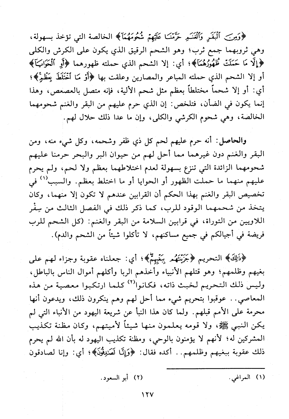 {وَمِنَ الْبَقَرِ وَالْغَنَمِ حَرَّمْنا عَلَيْهِمْ شُحُومَهُما} الخالصة التي تؤخذ بسهولة، وهي ثروبهما جمع ثرب؛ وهو الشحم الرقيق الذي يكون على الكرش والكلى {إِلَّا ما حَمَلَتْ ظُهُورُهُما}؛ أي: إلا الشحم الذي حملته ظهورهما {أَوِ الْحَوايا} أو إلا الشحم الذي حملته المباعر والمصارين وعلقت بها {أَوْ مَا اخْتَلَطَ بِعَظْمٍ}؛ أي: أو إلا شحما مختلطا بعظم مثل شحم الألية، فإنه متصل بالعصعص، وهذا إنما يكون في الضأن، فتلخص: إن الذي حرم عليهم من البقر والغنم شحومهما الخالصة، وهي شحوم الكرشي والكلى، وإن ما عدا ذلك حلال لهم.
