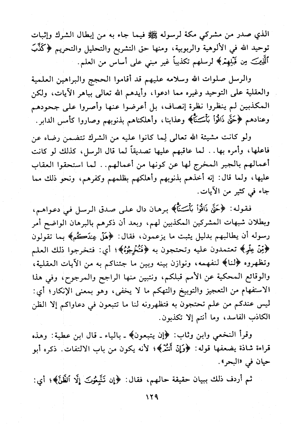 ولو كانت مشيئة الله تعالى لما كانوا عليه من الشرك تتضمن رضاه عن فاعلها، وأمره بها .. لما عاقبهم عليها تصديقا لما قال الرسل، كذلك لو كانت أعمالهم بالجبر المخرج لها عن كونها من أعمالهم .. لما استحقوا العقاب عليها، ولما قال: إنه أخذهم بذنوبهم وأهلكهم بظلمهم وكفرهم، ونحو ذلك مما جاء في كثير من الآيات.