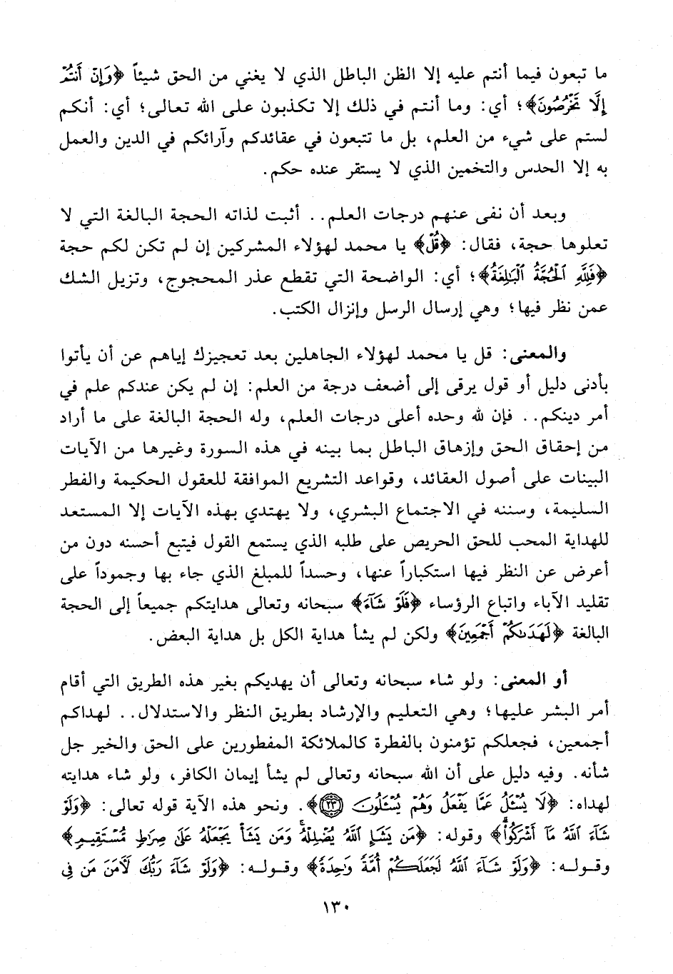 149 - وبعد أن نفى عنهم درجات العلم .. أثبت لذاته الحجة البالغة التي لا تعلوها حجة، فقال: {قُلْ} يا محمد لهؤلاء المشركين إن لم تكن لكم حجة {فَلِلَّهِ الْحُجَّةُ الْبالِغَةُ}؛ أي: الواضحة التي تقطع عذر المحجوج، وتزيل الشك عمن نظر فيها؛ وهي إرسال الرسل وإنزال الكتب.