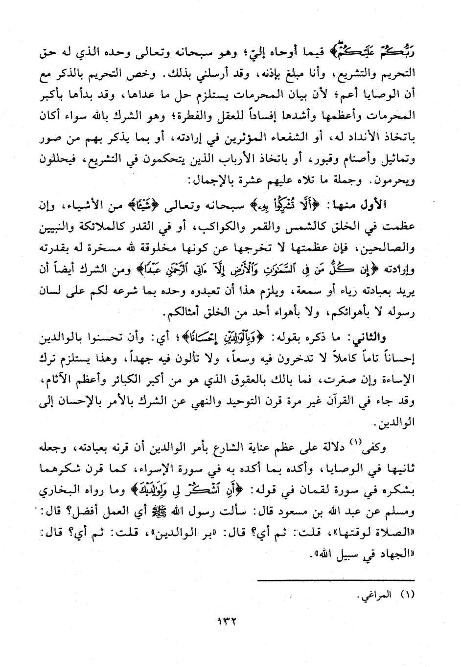 وكفى (¬1) دلالة على عظم عناية الشارع بأمر الوالدين أن قرنه بعبادته، وجعله ثانيها في الوصايا، وأكده بما أكده به في سورة الإسراء، كما قرن شكرهما بشكره في سورة لقمان في قوله: {أَنِ اشْكُرْ لِي وَلِوالِدَيْكَ} وما رواه البخاري ومسلم عن عبد الله بن مسعود قال: سألت رسول الله صلى الله عليه وسلم أي العمل أفضل؟ قال: «الصلاة لوقتها»، قلت: ثم أي؟ قال: «بر الوالدين»، قلت: ثم أي؟ قال: «الجهاد في سبيل الله».