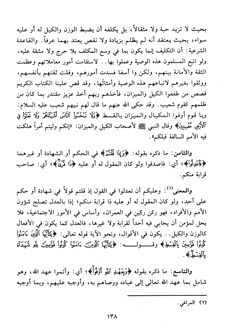 بحيث لا تزيد حبة ولا مثقالا، بل يكلفه أن يضبط الوزن والكيل له أو عليه سواء، بحيث يعتقد أنه لم يظلم بزيادة ولا نقص يعتد بهما عرفا. والقاعدة الشرعية: أن التكليف إنما يكون بما في وسع المكلف بلا حرج ولا مشقة عليه، ولو اتبع المسلمون هذه الوصية وعملوا بها .. لاستقامت أمور معاملاتهم وعظمت الثقة والأمانة بينهم، ولكن وا أسفا فسدت أمورهم، وقلت ثقتهم بأنفسهم، ووثقوا بغيرهم لاتباعهم هذه الوصية وأمثالها، وقد قص علينا الكتاب الكريم قصص من طففوا الكيل والميزان، فأخذهم ربهم أخذ عزيز مقتدر بما كان من ظلمهم كقوم شعيب. وقد حكى الله عنهم ما قال لهم نبيهم شعيب عليه السلام: ويا قوم أوفوا المكيال والميزان بالقسط {وَلا تَبْخَسُوا النَّاسَ أَشْياءَهُمْ وَلا تَعْثَوْا فِي الْأَرْضِ مُفْسِدِينَ} وقال النبي صلى الله عليه وسلم لأصحاب الكيل والميزان: «إنكم وليتم أمرا هلكت فيه الأمم السالفة قبلكم».