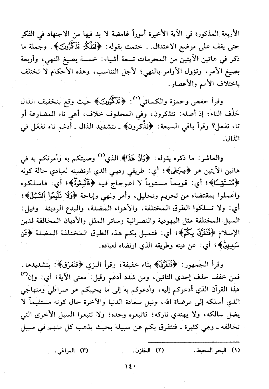 الأربعة المذكورة في الآية الأخيرة أمورا غامضة لا بد فيها من الاجتهاد في الفكر حتى يقف على موضع الاعتدال .. ختمت بقوله: {لَعَلَّكُمْ تَذَكَّرُونَ}. وجملة ما ذكر في هاتين الآيتين من المحرمات تسعة أشياء: خمسة بصيغ النهي، وأربعة بصيغ الأمر، وتؤول الأوامر بالنهي؛ لأجل التناسب، وهذه الأحكام لا تختلف باختلاف الأمم والأعصار.