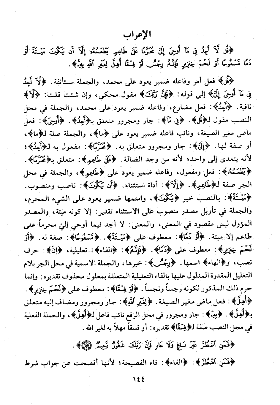 {قُلْ} فعل أمر وفاعله ضمير يعود على محمد، والجملة مستأنفة. {لا أَجِدُ فِي ما أُوحِيَ إِلَيَّ} إلى قوله: {فَإِنَّ رَبَّكَ} مقول محكي، وإن شئت قلت: {لا} نافية. {أَجِدُ}: فعل مضارع، وفاعله ضمير يعود على محمد، والجملة في محل النصب مقول لـ {قُلْ}. {فِي ما}: جار ومجرور متعلق بـ {أَجِدُ}. {أُوحِيَ}: فعل ماض مغير الصيغة، ونائب فاعله ضمير يعود على {ما}، والجملة صلة لـ {ما}، أو صفة لها. {إِلَيَّ}: جار ومجرور متعلق به. {مُحَرَّمًا}: مفعول به لـ {أَجِدُ}؛ لأنه يتعدى إلى واحد؛ لأنه من وجد الضالة. {عَلى طاعِمٍ}: متعلق بـ {مُحَرَّمًا}. {يَطْعَمُهُ}: فعل ومفعول، وفاعله ضمير يعود على {طاعِمٍ}، والجملة في محل الجر صفة لـ {طاعِمٍ}. {إِلَّا}: أداة استثناء. {أَنْ يَكُونَ}: ناصب ومنصوب. {مَيْتَةً}: بالنصب خبر {يَكُونَ}، واسمها ضمير يعود على الشيء المحرم، والجملة في تأويل مصدر منصوب على الاستثناء تقدير: إلا كونه ميتة، والمصدر المؤول ليس مقصود في المعنى، والمعنى: لا أجد فيما أوحي إليّ محرما على طاعم إلا ميتة. {أَوْ دَمًا}: معطوف على {مَيْتَةً}. {مَسْفُوحًا}: صفة له. {أَوْ لَحْمَ خِنزِيرٍ}: معطوف على {دَمًا}. {فَإِنَّهُ}: {الفاء}: تعليلية، {إنّ}: حرف نصب، و {الهاء} اسمها. {رِجْسٌ}: خبرها، والجملة الاسمية في محل الجر بلام التعليل المقدرة المدلول عليها بالفاء التعليلية المتعلقة بمعلول محذوف تقديره: وإنما حرم ذلك المذكور لكونه رجسا ونجسا. {أَوْ فِسْقًا}: معطوف على {لَحْمَ خِنزِيرٍ}. {أُهِلَّ}: فعل ماض مغير الصيغة. {لِغَيْرِ اللَّهِ}: جار ومجرور ومضاف إليه متعلق بـ {أُهِلَّ}. {بِهِ}: جار ومجرور في محل الرفع نائب فاعل لـ {أُهِلَّ}، والجملة الفعلية في محل النصب صفة لـ {فِسْقًا} تقديره: أو فسقا مهلا به لغير الله.