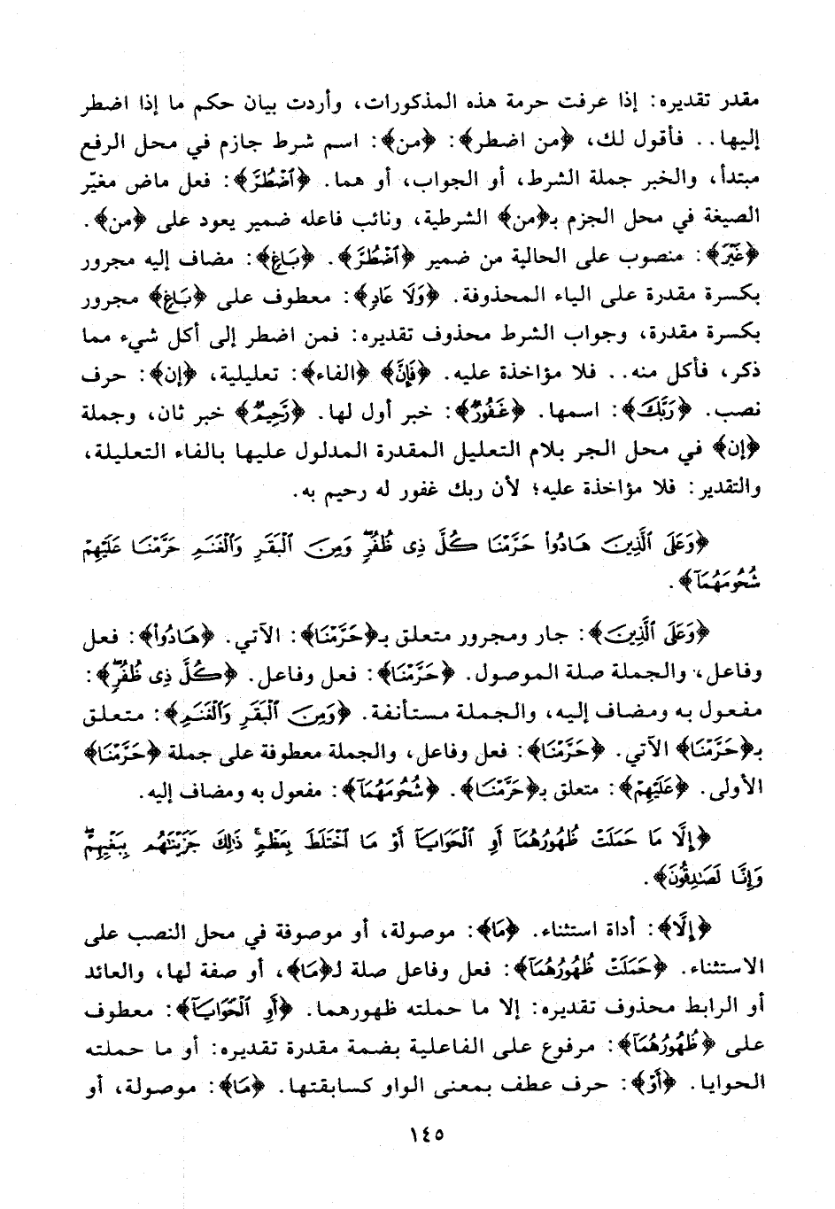 مقدر تقديره: إذا عرفت حرمة هذه المذكورات، وأردت بيان حكم ما إذا اضطر إليها .. فأقول لك، {من اضطر}: {من}: اسم شرط جازم في محل الرفع مبتدأ، والخبر جملة الشرط، أو الجواب، أو هما. {اضْطُرَّ}: فعل ماض مغيّر الصيغة في محل الجزم بـ {من} الشرطية، ونائب فاعله ضمير يعود على {من}. {غَيْرَ}: منصوب على الحالية من ضمير {اضْطُرَّ}. {باغٍ}: مضاف إليه مجرور بكسرة مقدرة على الياء المحذوفة. {وَلا عادٍ}: معطوف على {باغٍ} مجرور بكسرة مقدرة، وجواب الشرط محذوف تقديره: فمن اضطر إلى أكل شيء مما ذكر، فأكل منه .. فلا مؤاخذة عليه. {فَإِنَّ} {الفاء}: تعليلية، {إن}: حرف نصب. {رَبَّكَ}: اسمها. {غَفُورٌ}: خبر أول لها. {رَحِيمٌ} خبر ثان، وجملة {إن} في محل الجر بلام التعليل المقدرة المدلول عليها بالفاء التعليلة، والتقدير: فلا مؤاخذة عليه؛ لأن ربك غفور له رحيم به.