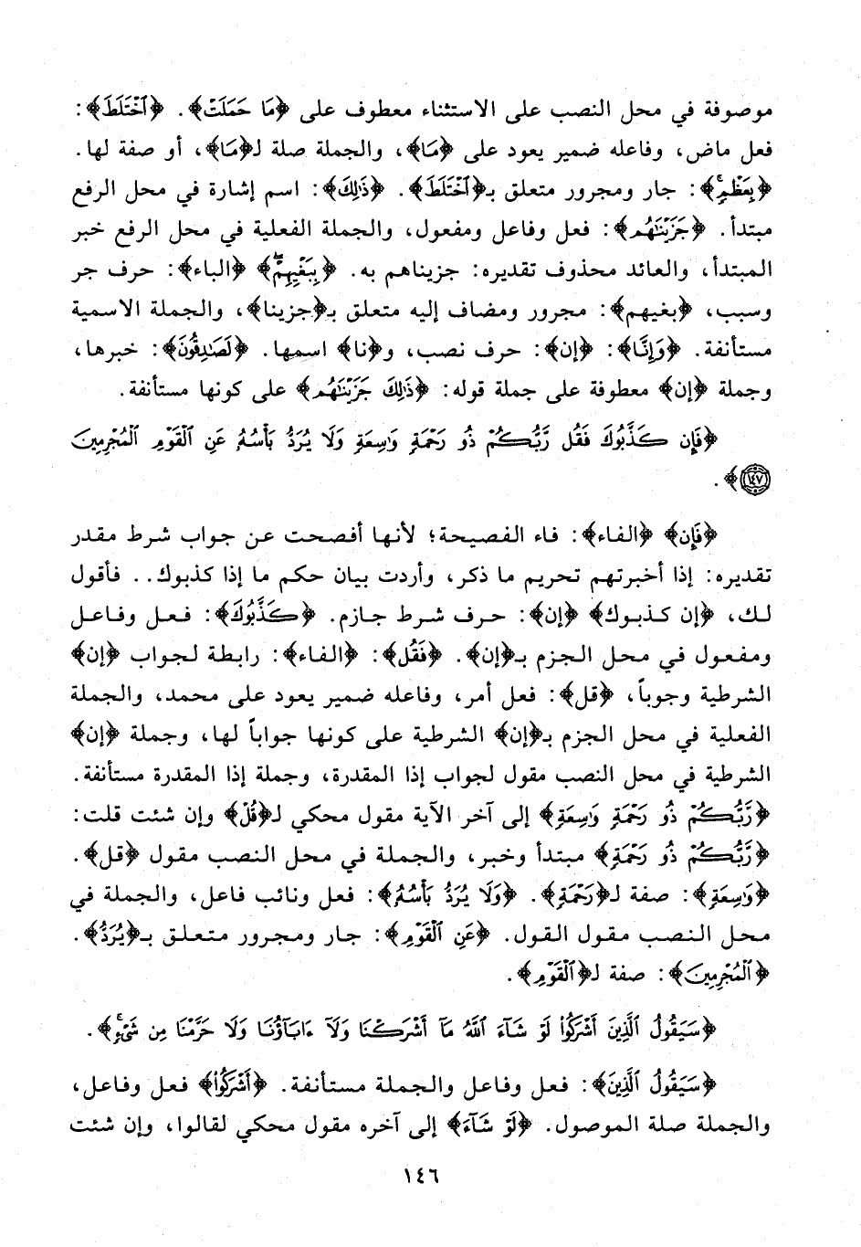 {فَإِنْ} {الفاء}: فاء الفصيحة؛ لأنها أفصحت عن جواب شرط مقدر تقديره: إذا أخبرتهم تحريم ما ذكر، وأردت بيان حكم ما إذا كذبوك .. فأقول لك، {إن كذبوك} {إن}: حرف شرط جازم. {كَذَّبُوكَ}: فعل وفاعل ومفعول في محل الجزم بـ {إن}. فَقُلْ: {الفاء}: رابطة لجواب {إن} الشرطية وجوبا، {قل}: فعل أمر، وفاعله ضمير يعود على محمد، والجملة الفعلية في محل الجزم بـ {إن} الشرطية على كونها جوابا لها، وجملة {إن} الشرطية في محل النصب مقول لجواب إذا المقدرة، وجملة إذا المقدرة مستأنفة. {رَبُّكُمْ ذُو رَحْمَةٍ واسِعَةٍ} إلى آخر الآية مقول محكي لـ {قل} وإن شئت قلت: {رَبُّكُمْ ذُو رَحْمَةٍ} مبتدأ وخبر، والجملة في محل النصب مقول {قل}. {واسِعَةٍ}: صفة لـ {رَحْمَةٍ}. {وَلا يُرَدُّ بَأْسُهُ}: فعل ونائب فاعل، والجملة في محل النصب مقول القول. {عَنِ الْقَوْمِ}: جار ومجرور متعلق بـ {يُرَدُّ}. {الْمُجْرِمِينَ}: صفة لـ {الْقَوْمِ}.