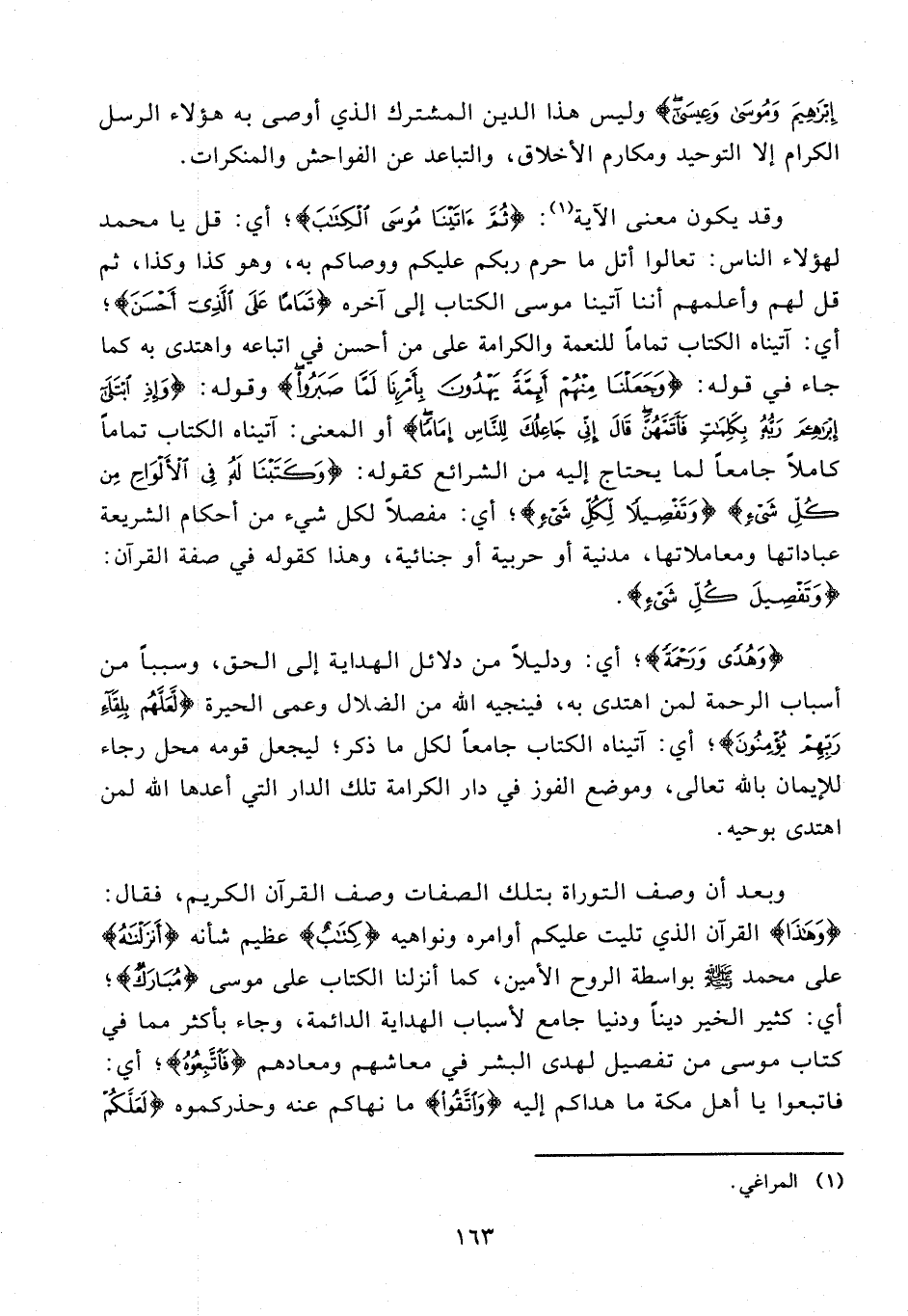 وقد يكون معنى الآية (¬1): {ثُمَّ آتَيْنا مُوسَى الْكِتابَ}؛ أي: قل يا محمد لهؤلاء الناس: تعالوا أتل ما حرم ربكم عليكم ووصاكم به، وهو كذا وكذا، ثم قل لهم وأعلمهم أننا آتينا موسى الكتاب إلى آخره {تَمامًا عَلَى الَّذِي أَحْسَنَ}؛ أي: آتيناه الكتاب تماما للنعمة والكرامة على من أحسن في اتباعه واهتدى به كما جاء في قوله: {وَجَعَلْنا مِنْهُمْ أَئِمَّةً يَهْدُونَ بِأَمْرِنا لَمَّا صَبَرُوا} وقوله: {وَإِذِ ابْتَلى إِبْراهِيمَ رَبُّهُ بِكَلِماتٍ فَأَتَمَّهُنَّ قالَ إِنِّي جاعِلُكَ لِلنَّاسِ إِمامًا} أو المعنى: آتيناه الكتاب تماما كاملا جامعا لما يحتاج إليه من الشرائع كقوله: {وَكَتَبْنا لَهُ فِي الْأَلْواحِ مِنْ كُلِّ شَيْءٍ وَتَفْصِيلًا لِكُلِّ شَيْءٍ}؛ أي: مفصلا لكل شيء من أحكام الشريعة عباداتها ومعاملاتها، مدنية أو حربية أو جنائية، وهذا كقوله في صفة القرآن: {وَتَفْصِيلَ كُلِّ شَيْءٍ}.