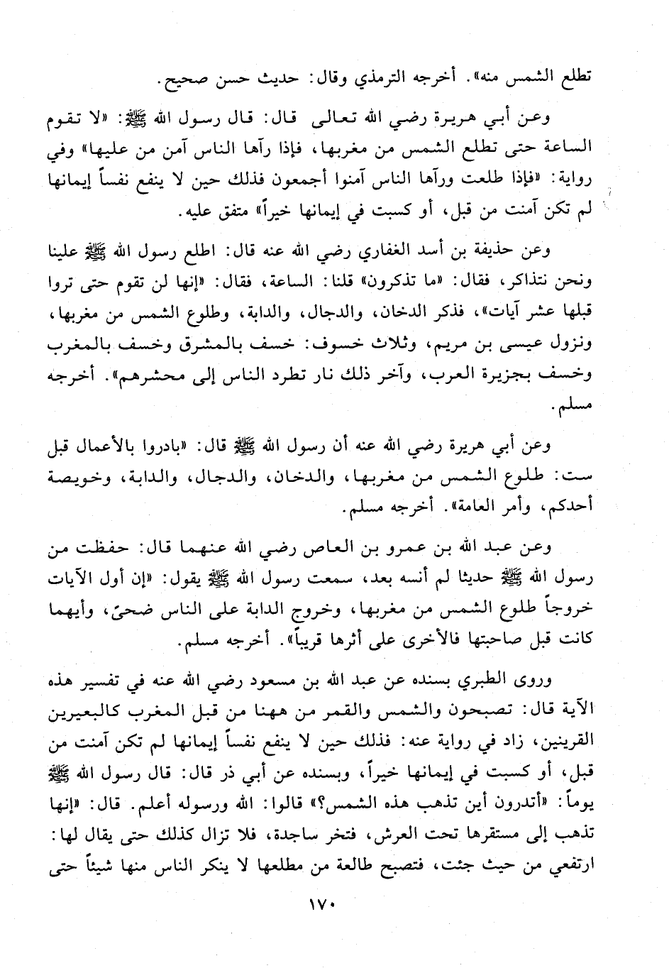 وروى الطبري بسنده عن عبد الله بن مسعود رضي الله عنه في تفسير هذه الآية قال: تصبحون والشمس والقمر من ههنا من قبل المغرب كالبعيرين القرينين، زاد في رواية عنه: فذلك حين لا ينفع نفسا إيمانها لم تكن آمنت من قبل، أو كسبت في إيمانها خيرا، وبسنده عن أبي ذر قال: قال رسول الله صلى الله عليه وسلم يوما: «أتدرون أين تذهب هذه الشمس؟» قالوا: الله ورسوله أعلم. قال: «إنها تذهب إلى مستقرها تحت العرش، فتخر ساجدة، فلا تزال كذلك حتى يقال لها: