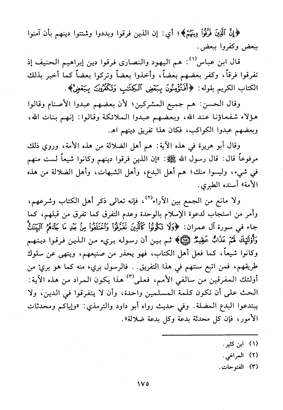ولا مانع من الجمع بين الآراء (¬2)، فإنه تعالى ذكر أهل الكتاب وشرعهم، وأمر من استجاب لدعوة الإسلام بالوحدة وعدم التفرق كما تفرق من قبلهم، كما جاء في سورة آل عمران: {وَلا تَكُونُوا كَالَّذِينَ تَفَرَّقُوا وَاخْتَلَفُوا مِنْ بَعْدِ ما جاءَهُمُ الْبَيِّناتُ وَأُولئِكَ لَهُمْ عَذابٌ عَظِيمٌ (105)} ثم بين أن رسوله بريء من الذين فرقوا دينهم وكانوا شيعا، كما فعل أهل الكتاب، فهو يحذر من صنيعهم، وينهى عن سلوك طريقهم، فمن اتبع سنتهم في هذا التفريق .. فالرسول بريء منه كما هو بريء من أولئك المفرقين من سالفي الأمم، فعلى (¬3) هذا يكون المراد من هذه الآية: الحث على أن تكون كلمة المسلمين واحدة، وأن لا يتفرقوا في الدين، ولا يبتدعوا البدع المضلة. وفي حديث رواه أبو داود والترمذي: «وإياكم ومحدثات الأمور، فإن كل محدثة بدعة وكل بدعة ضلالة».