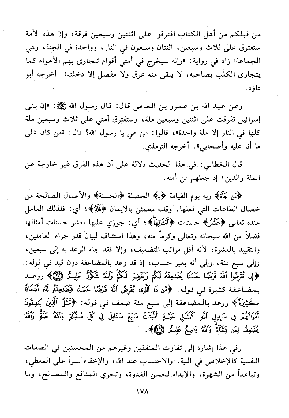 وعن عبد الله بن عمرو بن العاص قال: قال رسول الله صلى الله عليه وسلم: «إن بني إسرائيل تفرقت على اثنتين وسبعين ملة، وستفترق أمتي على ثلاث وسبعين ملة كلها في النار إلا ملة واحدة»، قالوا: من هي يا رسول الله؟ قال: «من كان على ما أنا عليه وأصحابي». أخرجه الترمذي.