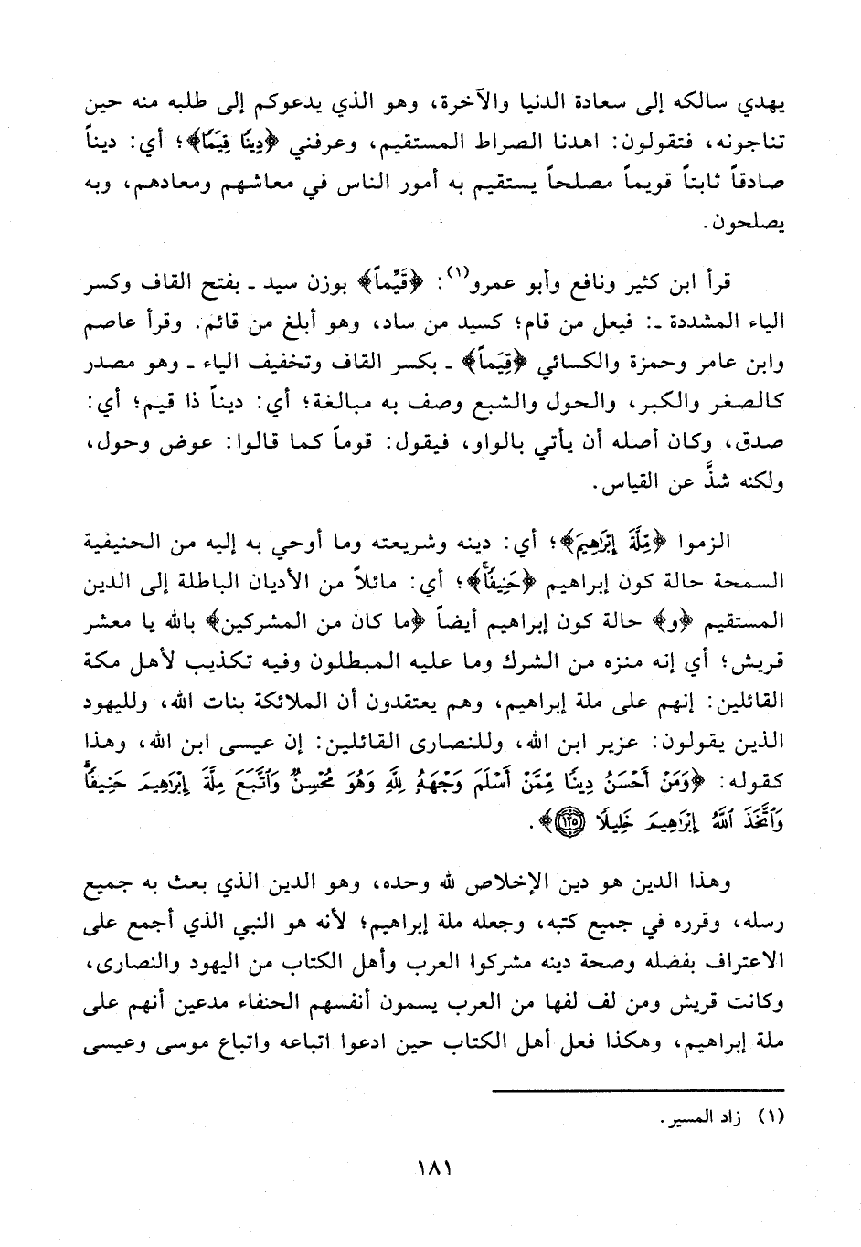 قرأ ابن كثير ونافع وأبو عمرو (¬1): {قيّما} بوزن سيد - بفتح القاف وكسر الياء المشددة -: فيعل من قام؛ كسيد من ساد، وهو أبلغ من قائم. وقرأ عاصم وابن عامر وحمزة والكسائي {قِيَمًا} - بكسر القاف وتخفيف الياء - وهو مصدر كالصغر والكبر، والحول والشبع وصف به مبالغة؛ أي: دينا ذا قيم؛ أي: صدق، وكان أصله أن يأتي بالواو، فيقول: قوما كما قالوا: عوض وحول، ولكنه شذّ عن القياس.