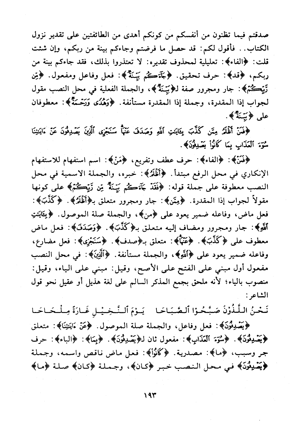 {فَمَنْ}: {الفاء}: حرف عطف وتفريع، {من}: اسم استفهام للاستفهام الإنكاري في محل الرفع مبتدأ. {أَظْلَمُ}: خبره، والجملة الاسمية في محل النصب معطوفة على جملة قوله: {فَقَدْ جاءَكُمْ بَيِّنَةٌ مِنْ رَبِّكُمْ} على كونها مقولا لجواب إذا المقدرة. {مِمَّنْ}: جار ومجرور متعلق بـ {أَظْلَمُ}. {كَذَّبَ}: فعل ماض، وفاعله ضمير يعود على {من}، والجملة صلة الموصول. {بِآياتِ اللَّهِ}: جار ومجرور ومضاف إليه متعلق بـ {كَذَّبَ}. {وَصَدَفَ}: فعل ماض معطوف على {كَذَّبَ}. {عَنْها}: متعلق بـ {صَدَفَ}. {سَنَجْزِي}: فعل مضارع، وفاعله ضمير يعود على {الله}، والجملة مستأنفة. {الَّذِينَ}: في محل النصب مفعول أول مبني على الفتح على الأصح، وقيل: مبني على الياء، وقيل: منصوب بالياء؛ لأنه ملحق بجمع المذكر السالم على لغة هذيل أو عقيل نحو قول الشاعر: