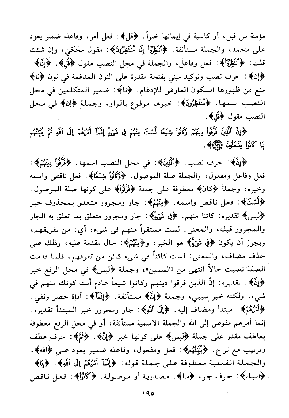 {إِنَّ}: حرف نصب. {الَّذِينَ}: في محل النصب اسمها. {فَرَّقُوا دِينَهُمْ}: فعل وفاعل ومفعول، والجملة صلة الموصول. {وَكانُوا شِيَعًا}: فعل ناقص واسمه وخبره، وجملة {كان} معطوفة على جملة {فَرَّقُوا} على كونها صلة الموصول. {لَسْتَ}: فعل ناقص واسمه. {مِنْهُمْ}: جار ومجرور متعلق بمحذوف خبر {ليس} تقديره: كائنا منهم. {فِي شَيْءٍ}: جار ومجرور متعلق بما تعلق به الجار والمجرور قبله، والمعنى: لست مستقرا منهم في شيء؛ أي: من تفريقهم، ويجوز أن يكون فِي شَيْءٍ هو الخبر، ومِنْهُمْ: حال مقدمة عليه، وذلك على حذف مضاف، والمعنى: لست كائنا في شيء كائن من تفرقهم، فلما قدمت الصفة نصبت حالا انتهى من «السمين»، وجملة {ليس} في محل الرفع خبر {إِنَّ}: تقديره: إِنَّ الَّذِينَ فَرَّقُوا دِينَهُمْ وَكانُوا شِيَعًا عادم أنت كونك منهم في شيء، ولكنه خبر سببي، وجملة {إِنَّ} مستأنفة. {إِنَّما}: أداة حصر ونفي. {أَمْرُهُمْ}: مبتدأ ومضاف إليه. {إِلَى اللَّهِ}: جار ومجرور خبر المبتدأ تقديره: إنما أمرهم مفوض إلى الله والجملة الاسمية مستأنفة، أو في محل الرفع معطوفة بعاطف مقدر على جملة {ليس} على كونها خبر {إِنَّ}. {ثُمَّ}: حرف عطف وترتيب مع تراخ. {يُنَبِّئُهُمْ}: فعل ومفعول، وفاعله ضمير يعود على {الله}، والجملة الفعلية معطوفة على جملة قوله: {إِنَّما أَمْرُهُمْ إِلَى اللَّهِ}. بِما: {الباء}: حرف جر، {ما}: مصدرية أو موصولة. {كانُوا}: فعل ناقص