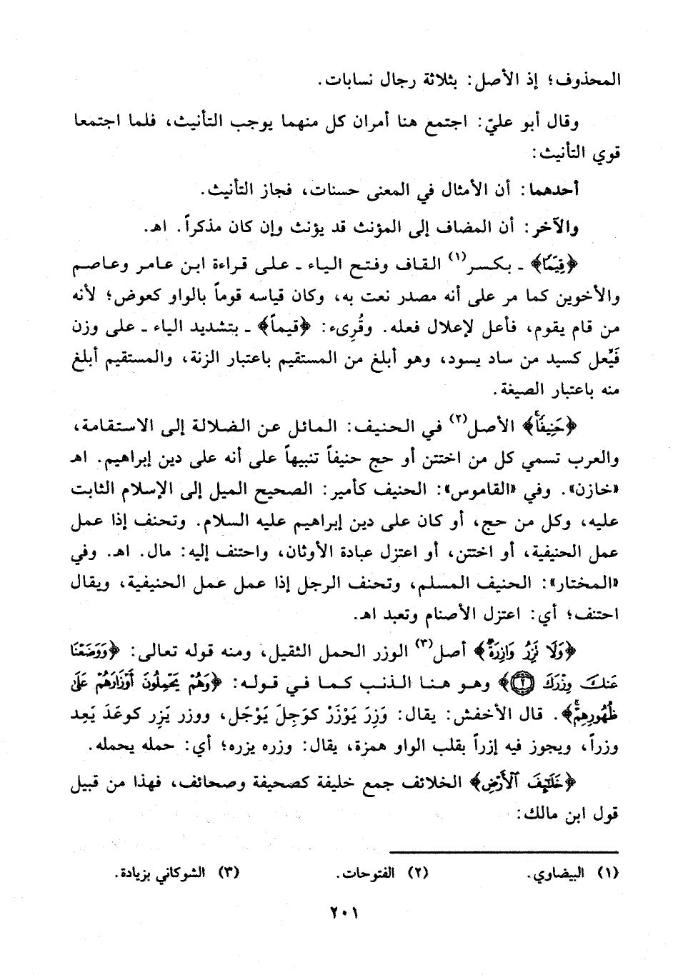 {قِيَمًا} - بكسر (¬1) القاف وفتح الياء - على قراءة ابن عامر وعاصم والأخوين كما مر على أنه مصدر نعت به، وكان قياسه قوما بالواو كعوض؛ لأنه من قام يقوم، فأعل لإعلال فعله. وقرىء: {قيما} - بتشديد الياء - على وزن فيّعل كسيد من ساد يسود، وهو أبلغ من المستقيم باعتبار الزنة، والمستقيم أبلغ منه باعتبار الصيغة.