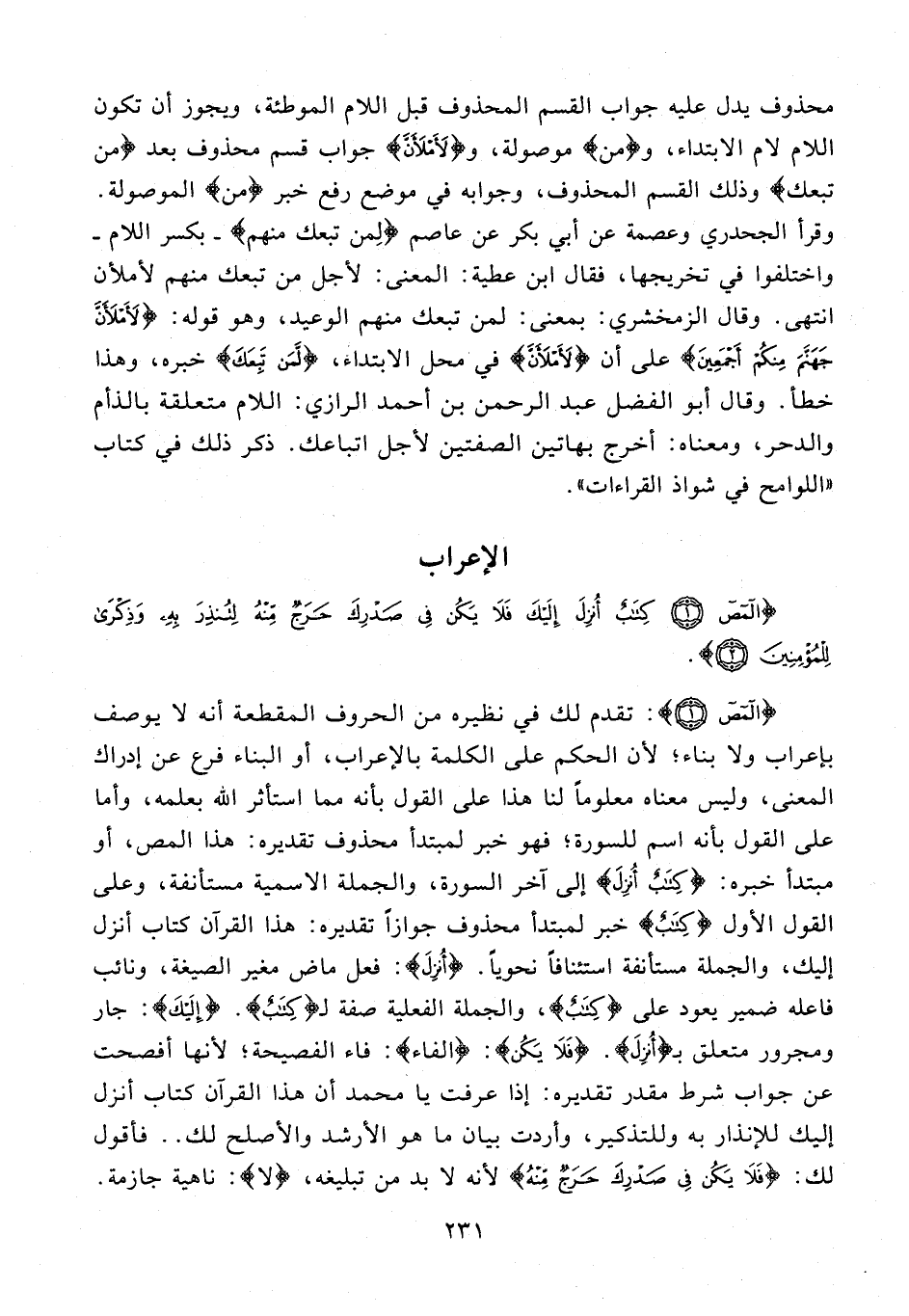{المص} (1): تقدم لك في نظيره من الحروف المقطعة أنه لا يوصف بإعراب ولا بناء؛ لأن الحكم على الكلمة بالإعراب، أو البناء فرع عن إدراك المعنى، وليس معناه معلوما لنا هذا على القول بأنه مما استأثر الله بعلمه، وأما على القول بأنه اسم للسورة؛ فهو خبر لمبتدأ محذوف تقديره: هذا المص، أو مبتدأ خبره: {كِتابٌ أُنْزِلَ} إلى آخر السورة، والجملة الاسمية مستأنفة، وعلى القول الأول {كِتابٌ} خبر لمبتدأ محذوف جوازا تقديره: هذا القرآن كتاب أنزل إليك، والجملة مستأنفة استئنافا نحويا. {أُنْزِلَ}: فعل ماض مغير الصيغة، ونائب فاعله ضمير يعود على {كِتابٌ}، والجملة الفعلية صفة لـ {كِتابٌ}. {إِلَيْكَ}: جار ومجرور متعلق بـ {أُنْزِلَ}. {فَلا يَكُنْ}: {الفاء}: فاء الفصيحة؛ لأنها أفصحت عن جواب شرط مقدر تقديره: إذا عرفت يا محمد أن هذا القرآن كتاب أنزل إليك للإنذار به وللتذكير، وأردت بيان ما هو الأرشد والأصلح لك .. فأقول لك: {فَلا يَكُنْ فِي صَدْرِكَ حَرَجٌ مِنْهُ} لأنه لا بد من تبليغه، {لا}: ناهية جازمة.