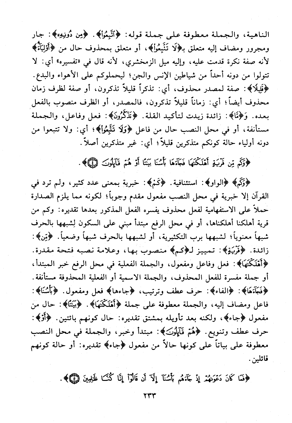 {وَكَمْ} {الواو}: استئنافية. {كَمْ}: خبرية بمعنى عدد كثير، ولم ترد في القرآن إلا خبرية في محل النصب مفعول مقدم وجوبا؛ لكونه مما يلزم الصدارة حملا على الاستفهامية لفعل محذوف يفسره الفعل المذكور بعدها تقديره: وكم من قرية أهلكنا أهلكناها، أو في محل الرفع مبتدأ مبني على السكون لشبهها بالحرف شبها معنويا؛ لشبهها برب التكثيرية، أو لشبهها بالحرف شبها وضعيا. {مِنْ}: زائدة. {قَرْيَةٍ}: تمييز لـ {كَمْ} منصوب بها، وعلامة نصبه فتحة مقدرة. {أَهْلَكْناها}: فعل وفاعل ومفعول، والجملة الفعلية في محل الرفع خبر المبتدأ، أو جملة مفسرة للفعل المحذوف، والجملة الاسمية أو الفعلية المحذوفة مستأنفة. {فَجاءَها}: {الفاء}: حرف عطف وترتيب، {جاءها} فعل ومفعول. {بَأْسُنا}: فاعل ومضاف إليه، والجملة معطوفة على جملة {أَهْلَكْناها}. {بَياتًا}: حال من مفعول {جاء}، ولكنه بعد تأويله بمشتق تقديره: حال كونهم بائتين. {أَوْ}: حرف عطف وتنويع. {هُمْ قائِلُونَ}: مبتدأ وخبر، والجملة في محل النصب معطوفة على بياتا على كونها حالا من مفعول {جاء} تقديره: أو حالة كونهم قائلين.