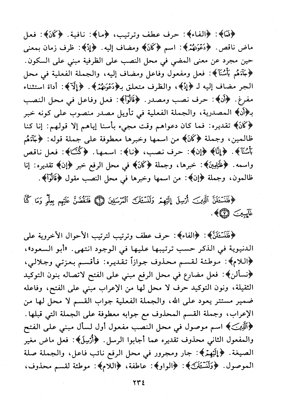 {فَلَنَسْئَلَنَّ}: {الفاء}: حرف عطف وترتيب لترتيب الأحوال الأخروية على الدنيوية في الذكر حسب ترتيبها عليها في الوجود انتهى. «أبو السعود»، {اللام}: موطئة لقسم محذوف جوازا تقديره: فأقسم بعزتي وجلالي، {نسألن}: فعل مضارع في محل الرفع مبني على الفتح لاتصاله بنون التوكيد الثقيلة، ونون التوكيد حرف لا محل لها من الإعراب مبني على الفتح، وفاعله ضمير مستتر يعود على الله، والجملة الفعلية جواب القسم لا محل لها من الإعراب، وجملة القسم المحذوف مع جوابه معطوفة على الجملة التي قبلها. {الَّذِينَ} اسم موصول في محل النصب مفعول أول لسأل مبني على الفتح والمفعول الثاني محذوف تقديره عما أجابوا الرسل. {أُرْسِلَ}: فعل ماض مغير الصيغة. {إِلَيْهِمْ}: جار ومجرور في محل الرفع نائب فاعل، والجملة صلة الموصول. {وَلَنَسْئَلَنَّ}: {الواو}: عاطفة، {اللام}: موطئة لقسم محذوف،