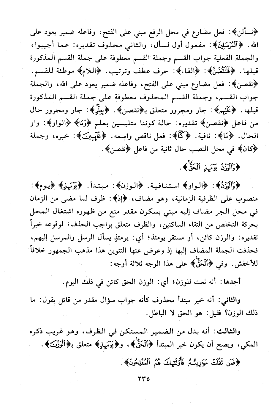 {وَالْوَزْنُ}: {الواو} استنافية. {الْوَزْنُ}: مبتدأ. {يَوْمَئِذٍ} {يوم}: منصوب على الظرفية الزمانية، وهو مضاف، {إذ}: ظرف لما مضى من الزمان في محل الجر مضاف إليه مبني بسكون مقدر منع من ظهوره اشتغال المحل بحركة التخلص من التقاء الساكنين، والظرف متعلق بواجب الحذف؛ لوقوعه خبرا تقديره: والوزن كائن، أو مستقر يومئذ؛ أي: يومئذ يسأل الرسل والمرسل إليهم، فحذفت الجملة المضاف إليها إذ وعوض عنها التنوين هذا مذهب الجمهور خلافا للأخفش. وفي {الْحَقُّ} على هذا الوجه ثلاثة أوجه: