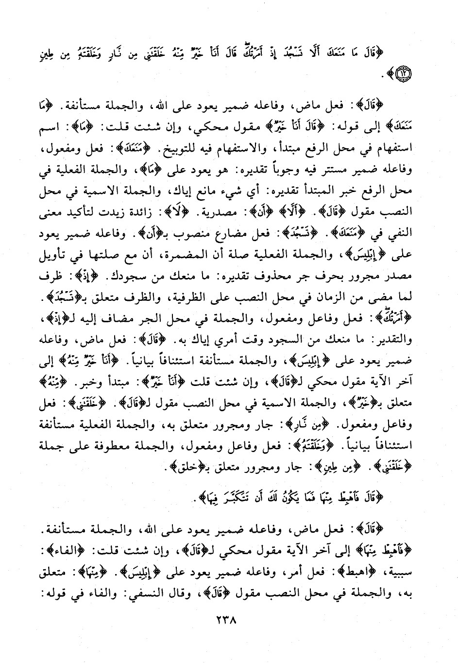 {قالَ}: فعل ماض، وفاعله ضمير يعود على الله، والجملة مستأنفة. {ما مَنَعَكَ} إلى قوله: قالَ {أَنَا خَيْرٌ} مقول محكي، وإن شئت قلت: ما: اسم استفهام في محل الرفع مبتدأ، والاستفهام فيه للتوبيخ. {مَنَعَكَ}: فعل ومفعول، وفاعله ضمير مستتر فيه وجوبا تقديره: هو يعود على ما، والجملة الفعلية في محل الرفع خبر المبتدأ تقديره: أي شيء مانع إياك، والجملة الاسمية في محل النصب مقول {قالَ}. {أَلَّا} {أن}: مصدرية. {لا}: زائدة زيدت لتأكيد معنى النفي في {مَنَعَكَ}. {تَسْجُدَ}: فعل مضارع منصوب بـ {أن}. وفاعله ضمير يعود على {إبليس}، والجملة الفعلية صلة أن المضمرة، أن مع صلتها في تأويل مصدر مجرور بحرف جر محذوف تقديره: ما منعك من سجودك. {إِذْ}: ظرف لما مضى من الزمان في محل النصب على الظرفية، والظرف متعلق بـ {تَسْجُدَ}. {أَمَرْتُكَ}: فعل وفاعل ومفعول، والجملة في محل الجر مضاف إليه لـ إِذْ {،} والتقدير: ما منعك من السجود وقت أمري إياك به. {قالَ}: فعل ماض، وفاعله ضمير يعود على {إبليس}، والجملة مستأنفة استئنافا بيانيا. {أَنَا خَيْرٌ مِنْهُ} إلى آخر الآية مقول محكي لـ {قالَ}، وإن شئت قلت {أَنَا خَيْرٌ}: مبتدأ وخبر. {مِنْهُ} متعلق بـ {خَيْرٌ}، والجملة الاسمية في محل النصب مقول لـ {قالَ}. {خَلَقْتَنِي}: فعل وفاعل ومفعول. {مِنْ نارٍ}: جار ومجرور متعلق به، والجملة الفعلية مستأنفة استئنافا بيانيا. {وَخَلَقْتَهُ}: فعل وفاعل ومفعول، والجملة معطوفة على جملة {خَلَقْتَنِي}. {مِنْ طِينٍ}: جار ومجرور متعلق بـ {خلق}.