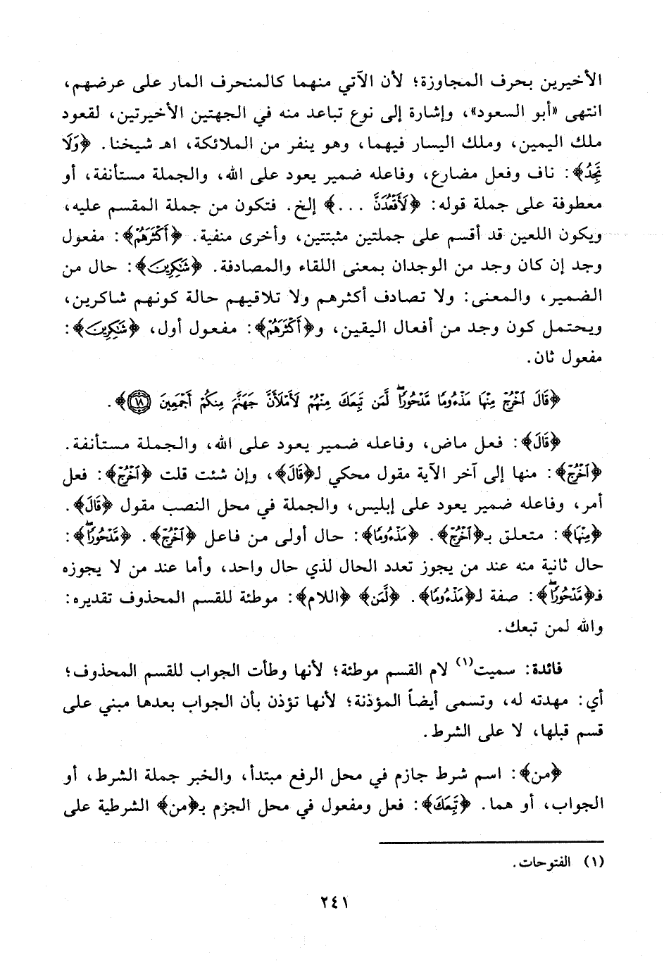 {قالَ}: فعل ماض، وفاعله ضمير يعود على الله، والجملة مستأنفة. {اخْرُجْ}: منها إلى آخر الآية مقول محكي لـ {قالَ}، وإن شئت قلت {اخْرُجْ}: فعل أمر، وفاعله ضمير يعود على إبليس، والجملة في محل النصب مقول {قالَ}. {مِنْها}: متعلق بـ {اخْرُجْ}. {مَذْؤُمًا}: حال أولى من فاعل {اخْرُجْ}. {مَدْحُورًا}: حال ثانية منه عند من يجوز تعدد الحال لذي حال واحد، وأما عند من لا يجوزه فـ {مَدْحُورًا}: صفة لـ {مَذْؤُمًا}. {لَمَنْ} {اللام}: موطئة للقسم المحذوف تقديره: والله لمن تبعك.