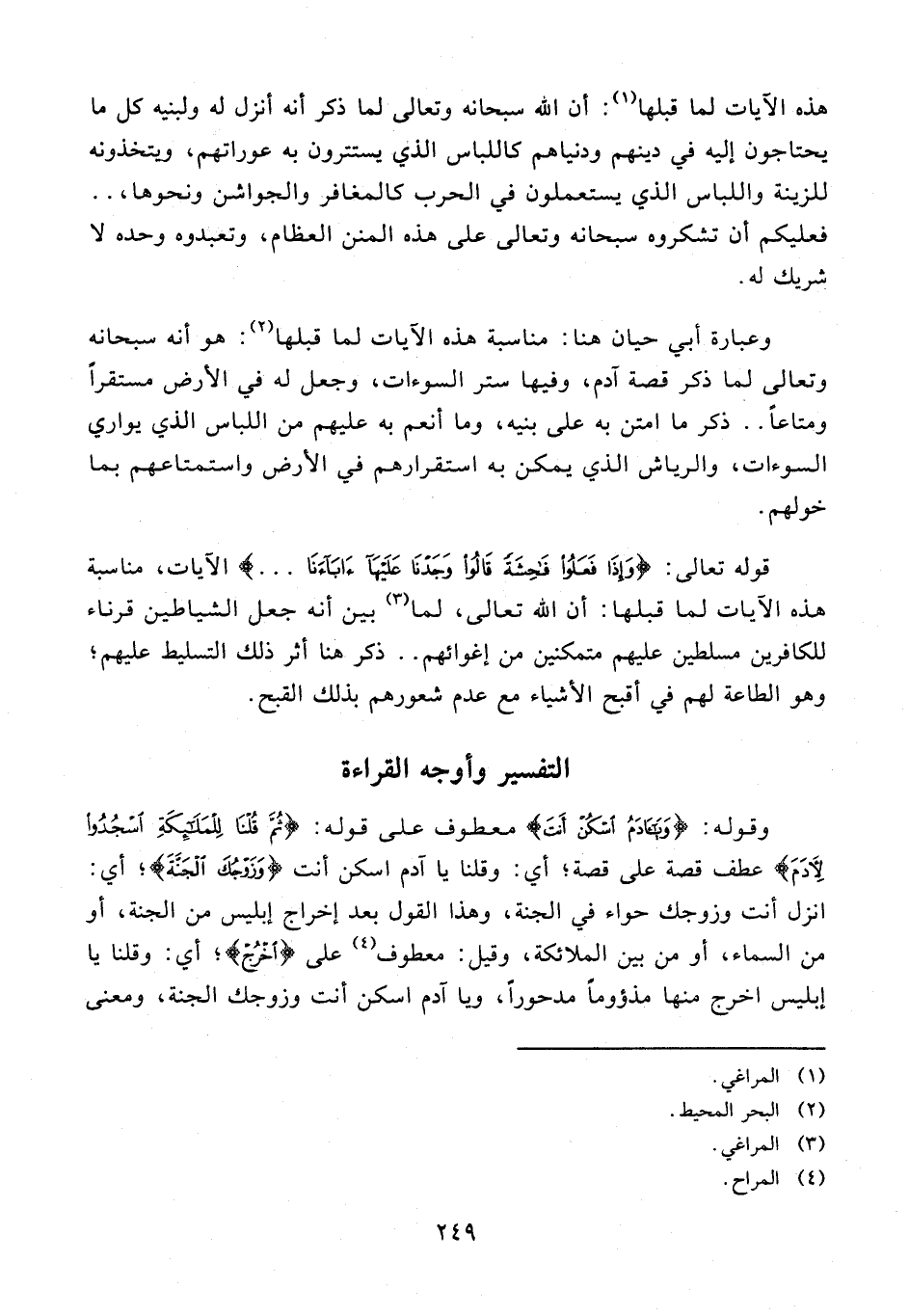 وعبارة أبي حيان هنا: مناسبة هذه الآيات لما قبلها (¬2): هو أنه سبحانه وتعالى لما ذكر قصة آدم، وفيها ستر السوءات، وجعل له في الأرض مستقرا ومتاعا .. ذكر ما امتن به على بنيه، وما أنعم به عليهم من اللباس الذي يواري السوءات، والرياش الذي يمكن به استقرارهم في الأرض واستمتاعهم بما خولهم.