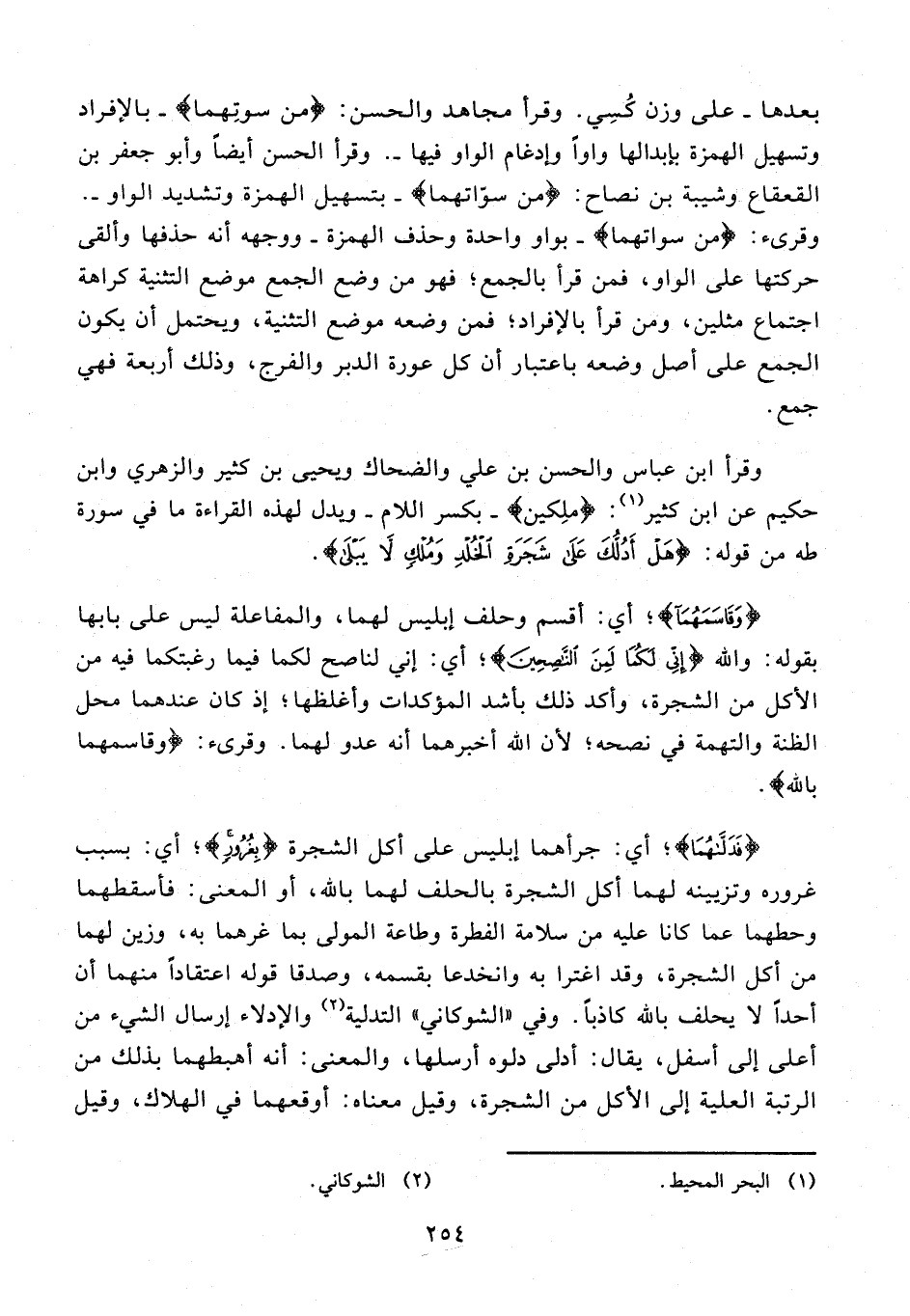 21 - {وَقاسَمَهُما}؛ أي: أقسم وحلف إبليس لهما، والمفاعلة ليس على بابها بقوله: {والله إِنِّي لَكُما لَمِنَ النَّاصِحِينَ}؛ أي: إني لناصح لكما فيما رغبتكما فيه من الأكل من الشجرة، وأكد ذلك بأشد المؤكدات وأغلظها؛ إذ كان عندهما محل الظنة والتهمة في نصحه؛ لأن الله أخبرهما أنه عدو لهما. وقرىء: {وقاسمهما بالله}.