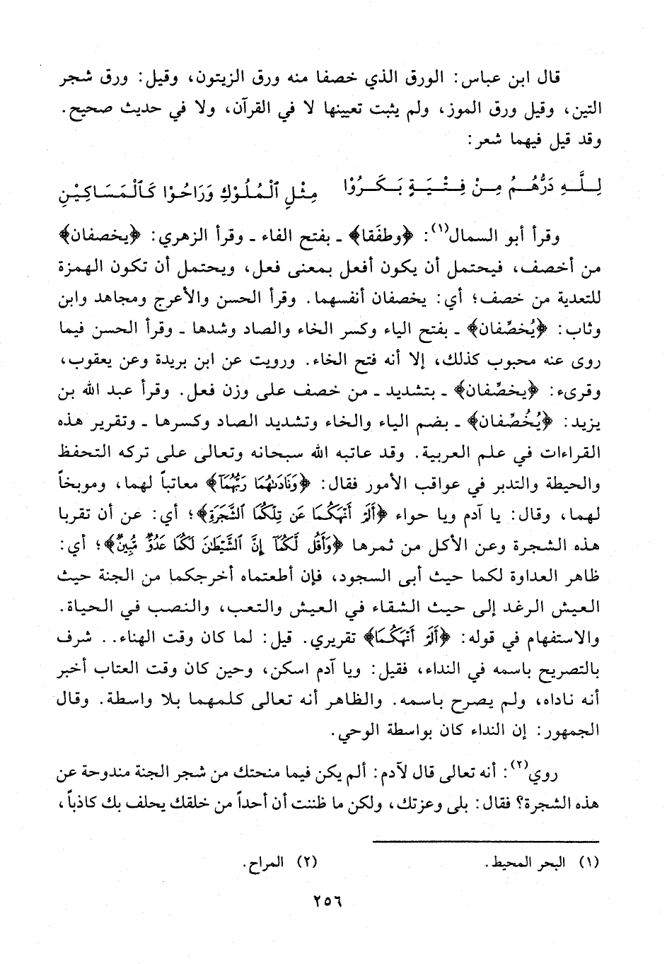 وقرأ أبو السمال (¬1): {وطفقا} - بفتح الفاء - وقرأ الزهري: {يخصفان} من أخصف، فيحتمل أن يكون أفعل بمعنى فعل، ويحتمل أن تكون الهمزة للتعدية من خصف؛ أي: يخصفان أنفسهما. وقرأ الحسن والأعرج ومجاهد وابن وثاب: {يخصّفان} - بفتح الياء وكسر الخاء والصاد وشدها - وقرأ الحسن فيما روى عنه محبوب كذلك، إلا أنه فتح الخاء. ورويت عن ابن بريدة وعن يعقوب، وقرىء: {يخصّفان} - بتشديد - من خصف على وزن فعل. وقرأ عبد الله بن يزيد: {يخصّفان} - بضم الياء والخاء وتشديد الصاد وكسرها - وتقرير هذه القراءات في علم العربية. وقد عاتبه الله سبحانه وتعالى على تركه التحفظ والحيطة والتدبر في عواقب الأمور فقال: {وَناداهُما رَبُّهُما} معاتبا لهما، وموبخا لهما، وقال: يا آدم ويا حواء {أَلَمْ أَنْهَكُما عَنْ تِلْكُمَا الشَّجَرَةِ}؛ أي: عن أن تقربا هذه الشجرة وعن الأكل من ثمرها {وَأَقُلْ لَكُما إِنَّ الشَّيْطانَ لَكُما عَدُوٌّ مُبِينٌ}؛ أي: ظاهر العداوة لكما حيث أبى السجود، فإن أطعتماه أخرجكما من الجنة حيث العيش الرغد إلى حيث الشقاء في العيش والتعب، والنصب في الحياة. والاستفهام في قوله: {أَلَمْ أَنْهَكُما} تقريري. قيل: لما كان وقت الهناء .. شرف بالتصريح باسمه في النداء، فقيل: ويا آدم اسكن، وحين كان وقت العتاب أخبر أنه ناداه، ولم يصرح باسمه. والظاهر أنه تعالى كلمهما بلا واسطة. وقال الجمهور: إن النداء كان بواسطة الوحي.