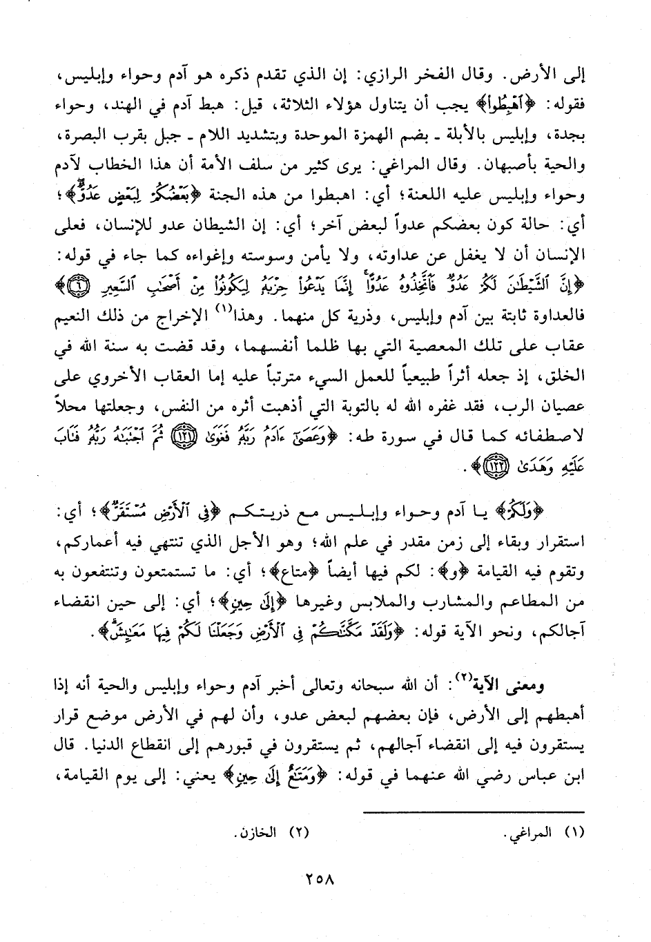 ومعنى الآية (¬2): أن الله سبحانه وتعالى أخبر آدم وحواء وإبليس والحية أنه إذا أهبطهم إلى الأرض، فإن بعضهم لبعض عدو، وأن لهم في الأرض موضع قرار يستقرون فيه إلى انقضاء آجالهم، ثم يستقرون في قبورهم إلى انقطاع الدنيا. قال ابن عباس رضي الله عنهما في قوله: {وَمَتاعٌ إِلى حِينٍ} يعني: إلى يوم القيامة،