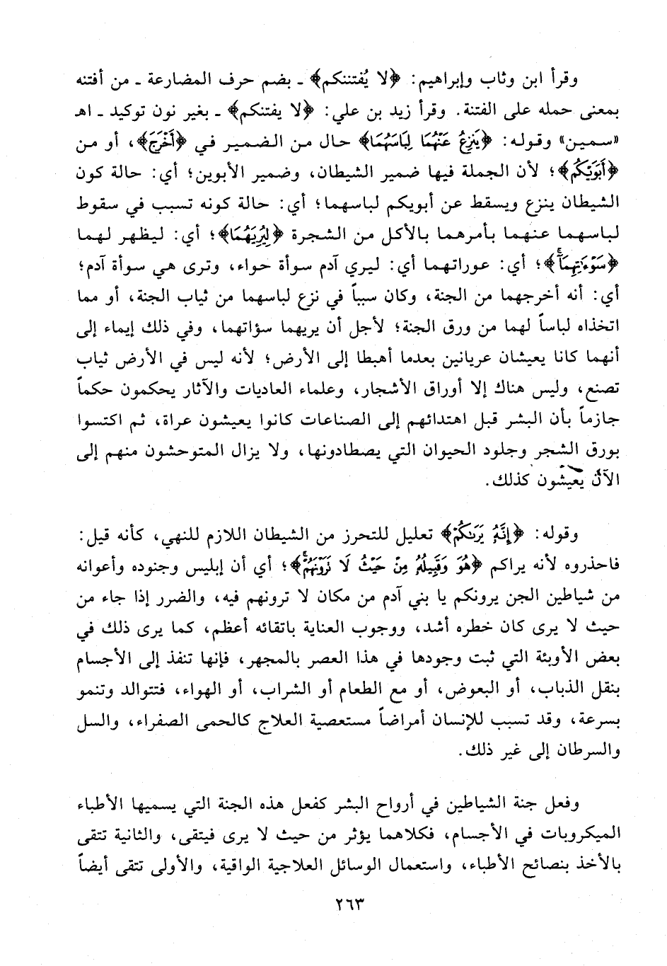 وقرأ ابن وثاب وإبراهيم: {لا يفتننكم} - بضم حرف المضارعة - من أفتنه بمعنى حمله على الفتنة. وقرأ زيد بن علي: {لا يَفْتِنَنَّكُمُ} - بغير نون توكيد - اه «سمين» وقوله: {يَنْزِعُ عَنْهُما لِباسَهُما} حال من الضمير في {أَخْرَجَ}، أو من {أَبَوَيْكُمْ}؛ لأن الجملة فيها ضمير الشيطان، وضمير الأبوين؛ أي: حالة كون الشيطان ينزع ويسقط عن أبويكم لباسهما؛ أي: حالة كونه تسبب في سقوط لباسهما عنهما بأمرهما بالأكل من الشجرة {لِيُرِيَهُما}؛ أي: ليظهر لهما {سَوْآتِهِما}؛ أي: عوراتهما أي: ليري آدم سوأة حواء، وترى هي سوأة آدم؛ أي: أنه أخرجهما من الجنة، وكان سببا في نزع لباسهما من ثياب الجنة، أو مما اتخذاه لباسا لهما من ورق الجنة؛ لأجل أن يريهما سؤاتهما، وفي ذلك إيماء إلى أنهما كانا يعيشان عريانين بعدما أهبطا إلى الأرض؛ لأنه ليس في الأرض ثياب تصنع، وليس هناك إلا أوراق الأشجار، وعلماء العاديات والآثار يحكمون حكما جازما بأن البشر قبل اهتدائهم إلى الصناعات كانوا يعيشون عراة، ثم اكتسوا بورق الشجر وجلود الحيوان التي يصطادونها، ولا يزال المتوحشون منهم إلى الآن يعيشون كذلك.
