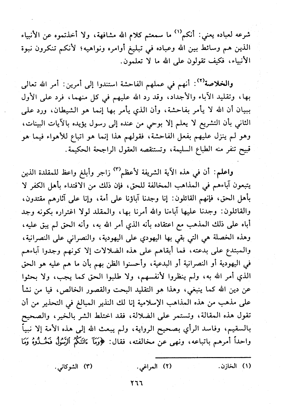واعلم: أن في هذه الآية الشريفة لأعظم (¬3) زاجر وأبلغ واعظ للمقلدة الذين يتبعون آباءهم في المذاهب المخالفة للحق، فإن ذلك من الاقتداء بأهل الكفر لا بأهل الحق، فإنهم القائلون: إنا وجدنا آباؤنا على أمة، وإنا على آثارهم مقتدون، والقائلون: وجدنا عليها آباءنا والله أمرنا بها، والمقلد لولا اغتراره بكونه وجد أباه على ذلك المذهب مع اعتقاده بأنه الذي أمر الله به، وأنه الحق لم يبق عليه، وهذه الخصلة هي التي بقي بها اليهودي على اليهودية، والنصراني على النصرانية، والمبتدع على بدعته، فما أبقاهم على هذه الضلالات إلا كونهم وجدوا آباءهم في اليهودية أو النصرانية أو البدعية، وأحسنوا الظن بهم بأن ما هم عليه هو الحق الذي أمر الله به، ولم ينظروا لأنفسهم، ولا طلبوا الحق كما يجب، ولا بحثوا عن دين الله كما ينبغي، وهذا هو التقليد البحت والقصور الخالص، فيا من نشأ على مذهب من هذه المذاهب الإسلامية إنا لك النذير المبالغ في التحذير من أن تقول هذه المقالة، وتستمر على الضلالة، فقد اختلط الشر بالخير، والصحيح بالسقيم، وفاسد الرأي بصحيح الرواية، ولم يبعث الله إلى هذه الأمة إلا نبيا واحدا أمرهم باتباعه، ونهى عن مخالفته، فقال: {وَما آتاكُمُ الرَّسُولُ فَخُذُوهُ وَما