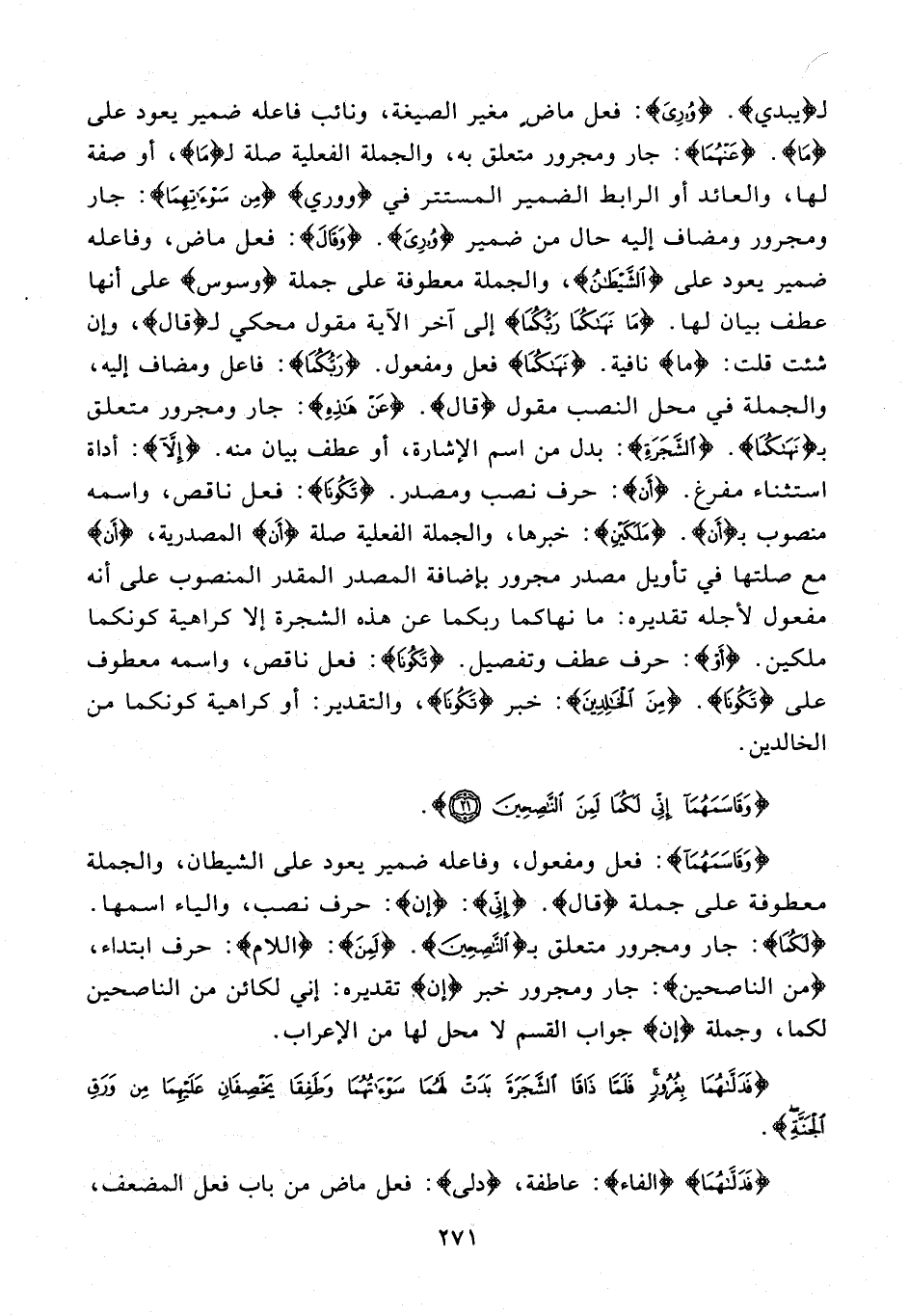 لـ {يبدي}. {وُورِيَ}: فعل ماض مغير الصيغة، ونائب فاعله ضمير يعود على {ما}. {عَنْهُما}: جار ومجرور متعلق به، والجملة الفعلية صلة لـ {ما}، أو صفة لها، والعائد أو الرابط الضمير المستتر في {وُورِيَ} مِنْ {سَوْآتِهِما}: جار ومجرور ومضاف إليه حال من ضمير {وُورِيَ}. {وَقالَ}: فعل ماض، وفاعله ضمير يعود على {الشَّيْطانُ}، والجملة معطوفة على جملة {فَوَسْوَسَ} على أنها عطف بيان لها. {ما نَهاكُما رَبُّكُما} إلى آخر الآية مقول محكي لـ {قالَ}، وإن شئت قلت: {ما} نافية. {نَهاكُما} فعل ومفعول. {رَبُّكُما}: فاعل ومضاف إليه، والجملة في محل النصب مقول {قالَ}. {عَنْ هذِهِ}: جار ومجرور متعلق بـ {نَهاكُما}. {الشَّجَرَةِ}: بدل من اسم الإشارة، أو عطف بيان منه. {إِلَّا}: أداة استثناء مفرغ. {أَنْ}: حرف نصب ومصدر. {تَكُونا}: فعل ناقص، واسمه منصوب بـ {أَنْ}. {مَلَكَيْنِ}: خبرها، والجملة الفعلية صلة {أَنْ} المصدرية، {أَنْ} مع صلتها في تأويل مصدر مجرور بإضافة المصدر المقدر المنصوب على أنه مفعول لأجله تقديره: ما نهاكما ربكما عن هذه الشجرة إلا كراهية كونكما ملكين. {أَوْ}: حرف عطف وتفصيل. {تَكُونا}: فعل ناقص، واسمه معطوف على {تَكُونا}. {مِنَ الْخالِدِينَ}: خبر {تَكُونا}، والتقدير: أو كراهية كونكما من الخالدين.