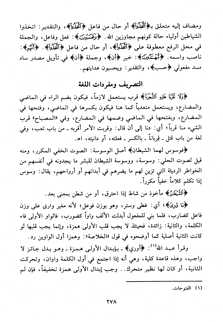 {وَلا تَقْرَبا هذِهِ الشَّجَرَةَ} قرب يستعمل لازما، فيكون بضم الراء في الماضي والمضارع، ويستعمل متعديا كما هنا فيكون بكسرها في الماضي، وفتحها في المضارع، وبفتحها في الماضي وضمها في المضارع، وفي «المصباح» قرب الشيء منا قربا؛ أي: دنا إلى أن قال: وقربت الأمر أقربه - من باب تعب، وفي لغة من باب قتل - قربانا - بالكسر - فعلته، أو دانيته، اه.