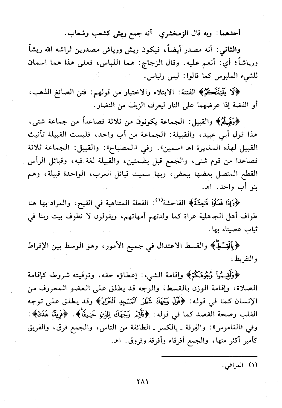 {وَأَقِيمُوا وُجُوهَكُمْ} وإقامة الشيء: إعطاؤه حقه، وتوفيته شروطه كإقامة الصلاة، وإقامة الوزن بالقسط، والوجه قد يطلق على العضو المعروف من الإنسان كما في قوله: {فَوَلِّ وَجْهَكَ شَطْرَ الْمَسْجِدِ الْحَرامِ} وقد يطلق على توجه القلب وصحة القصد كما في قوله: {فَأَقِمْ وَجْهَكَ لِلدِّينِ حَنِيفًا}. {فَرِيقًا هَدى}: وفي «القاموس»: والفرقة - بالكسر - الطائفة من الناس، والجمع فرق، والفريق كأمير أكثر منها، والجمع أفرقاء وأفرقة وفروق. اه.