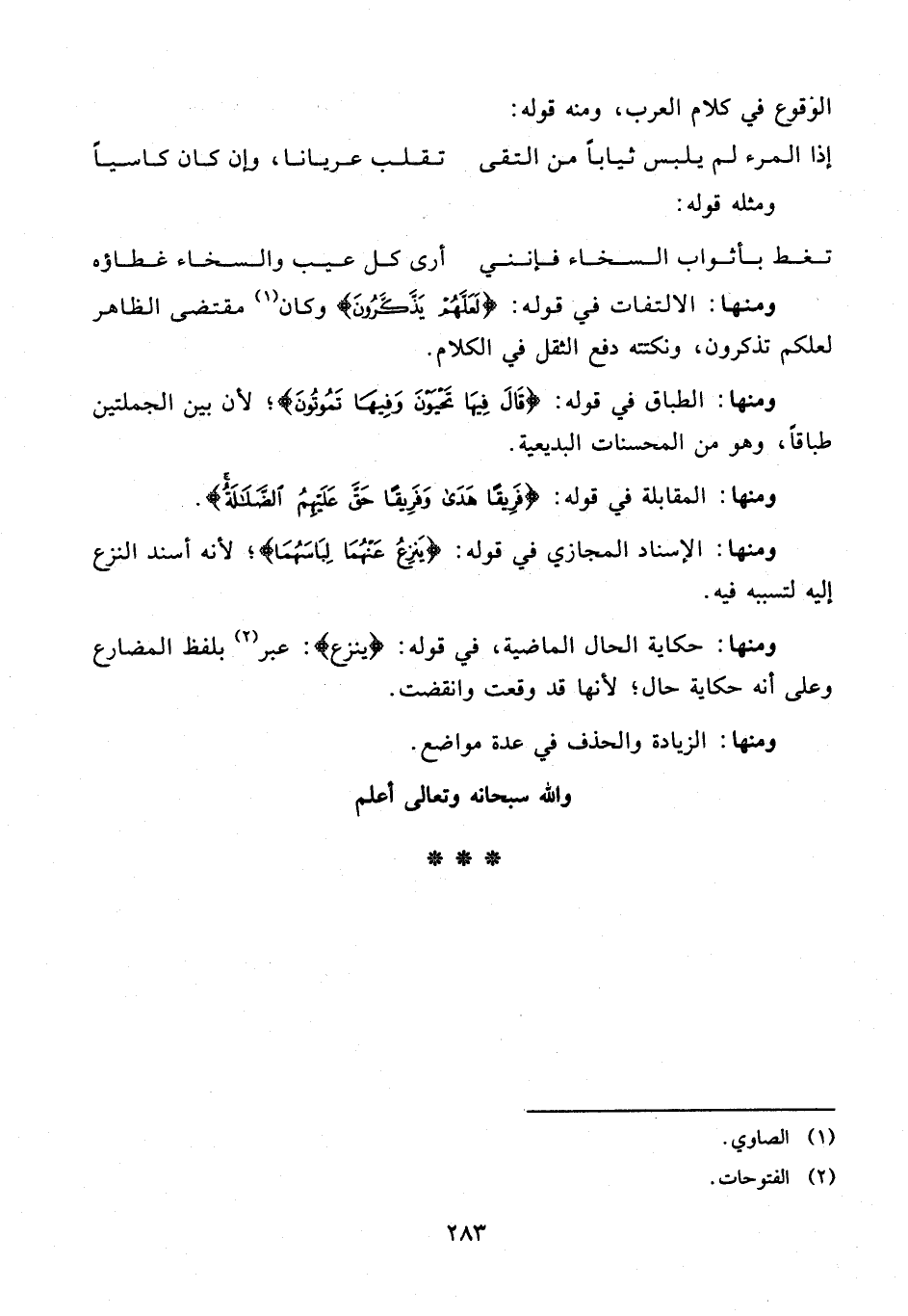ومنها: الطباق في قوله: {قالَ فِيها تَحْيَوْنَ وَفِيها تَمُوتُونَ}؛ لأن بين الجملتين طباقا، وهو من المحسنات البديعية.