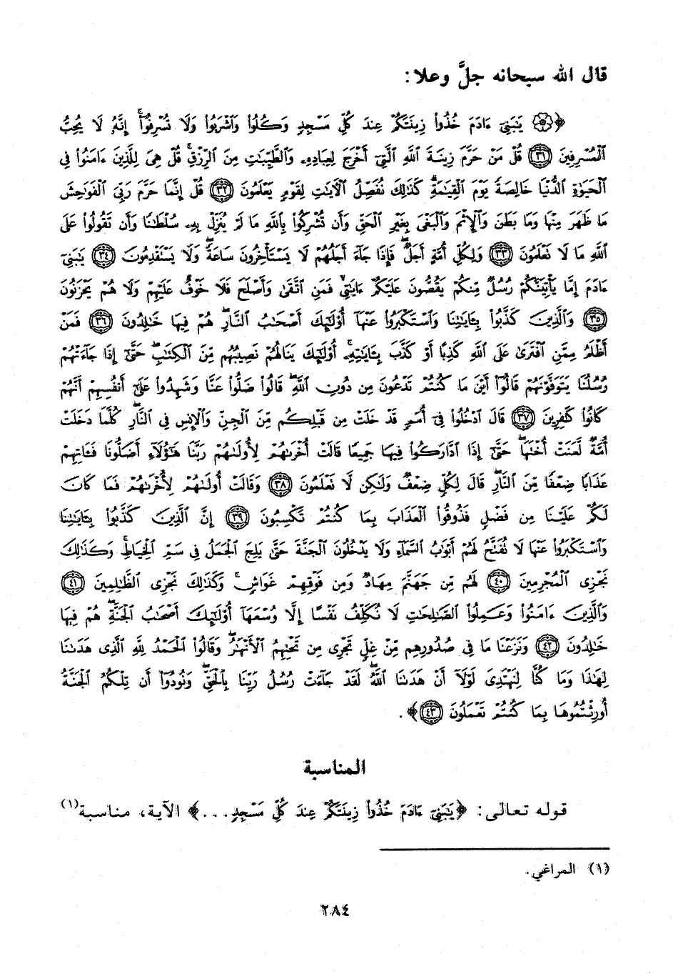 {يا بَنِي آدَمَ خُذُوا زِينَتَكُمْ عِنْدَ كُلِّ مَسْجِدٍ وَكُلُوا وَاشْرَبُوا وَلا تُسْرِفُوا إِنَّهُ لا يُحِبُّ الْمُسْرِفِينَ (31) قُلْ مَنْ حَرَّمَ زِينَةَ اللَّهِ الَّتِي أَخْرَجَ لِعِبادِهِ وَالطَّيِّباتِ مِنَ الرِّزْقِ قُلْ هِيَ لِلَّذِينَ آمَنُوا فِي الْحَياةِ الدُّنْيا خالِصَةً يَوْمَ الْقِيامَةِ كَذلِكَ نُفَصِّلُ الْآياتِ لِقَوْمٍ يَعْلَمُونَ (32) قُلْ إِنَّما حَرَّمَ رَبِّيَ الْفَواحِشَ ما ظَهَرَ مِنْها وَما بَطَنَ وَالْإِثْمَ وَالْبَغْيَ بِغَيْرِ الْحَقِّ وَأَنْ تُشْرِكُوا بِاللَّهِ ما لَمْ يُنَزِّلْ بِهِ سُلْطانًا وَأَنْ تَقُولُوا عَلَى اللَّهِ ما لا تَعْلَمُونَ (33) وَلِكُلِّ أُمَّةٍ أَجَلٌ فَإِذا جاءَ أَجَلُهُمْ لا يَسْتَأْخِرُونَ ساعَةً وَلا يَسْتَقْدِمُونَ (34) يا بَنِي آدَمَ إِمَّا يَأْتِيَنَّكُمْ رُسُلٌ مِنْكُمْ يَقُصُّونَ عَلَيْكُمْ آياتِي فَمَنِ اتَّقى وَأَصْلَحَ فَلا خَوْفٌ عَلَيْهِمْ وَلا هُمْ يَحْزَنُونَ (35) وَالَّذِينَ كَذَّبُوا بِآياتِنا وَاسْتَكْبَرُوا عَنْها أُولئِكَ أَصْحابُ النَّارِ هُمْ فِيها خالِدُونَ (36) فَمَنْ أَظْلَمُ مِمَّنِ افْتَرى عَلَى اللَّهِ كَذِبًا أَوْ كَذَّبَ بِآياتِهِ أُولئِكَ يَنالُهُمْ نَصِيبُهُمْ مِنَ الْكِتابِ حَتَّى إِذا جاءَتْهُمْ رُسُلُنا يَتَوَفَّوْنَهُمْ قالُوا أَيْنَ ما كُنْتُمْ تَدْعُونَ مِنْ دُونِ اللَّهِ قالُوا ضَلُّوا عَنَّا وَشَهِدُوا عَلى أَنْفُسِهِمْ أَنَّهُمْ كانُوا كافِرِينَ (37) قالَ ادْخُلُوا فِي أُمَمٍ قَدْ خَلَتْ مِنْ قَبْلِكُمْ مِنَ الْجِنِّ وَالْإِنْسِ فِي النَّارِ كُلَّما دَخَلَتْ أُمَّةٌ لَعَنَتْ أُخْتَها حَتَّى إِذَا ادَّارَكُوا فِيها جَمِيعًا قالَتْ أُخْراهُمْ لِأُولاهُمْ رَبَّنا هؤُلاءِ أَضَلُّونا فَآتِهِمْ عَذابًا ضِعْفًا مِنَ النَّارِ قالَ لِكُلٍّ ضِعْفٌ وَلكِنْ لا تَعْلَمُونَ (38) وَقالَتْ أُولاهُمْ لِأُخْراهُمْ فَما كانَ لَكُمْ عَلَيْنا مِنْ فَضْلٍ فَذُوقُوا الْعَذابَ بِما كُنْتُمْ تَكْسِبُونَ (39) إِنَّ الَّذِينَ كَذَّبُوا بِآياتِنا وَاسْتَكْبَرُوا عَنْها لا تُفَتَّحُ لَهُمْ أَبْوابُ السَّماءِ وَلا يَدْخُلُونَ الْجَنَّةَ حَتَّى يَلِجَ الْجَمَلُ فِي سَمِّ الْخِياطِ وَكَذلِكَ نَجْزِي الْمُجْرِمِينَ (40)