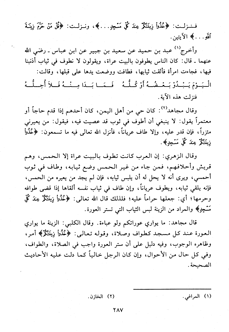 فنزلت: {خُذُوا زِينَتَكُمْ عِنْدَ كُلِّ مَسْجِدٍ ...}، ونزلت: {قُلْ مَنْ حَرَّمَ زِينَةَ اللَّهِ ...} الآيتين.