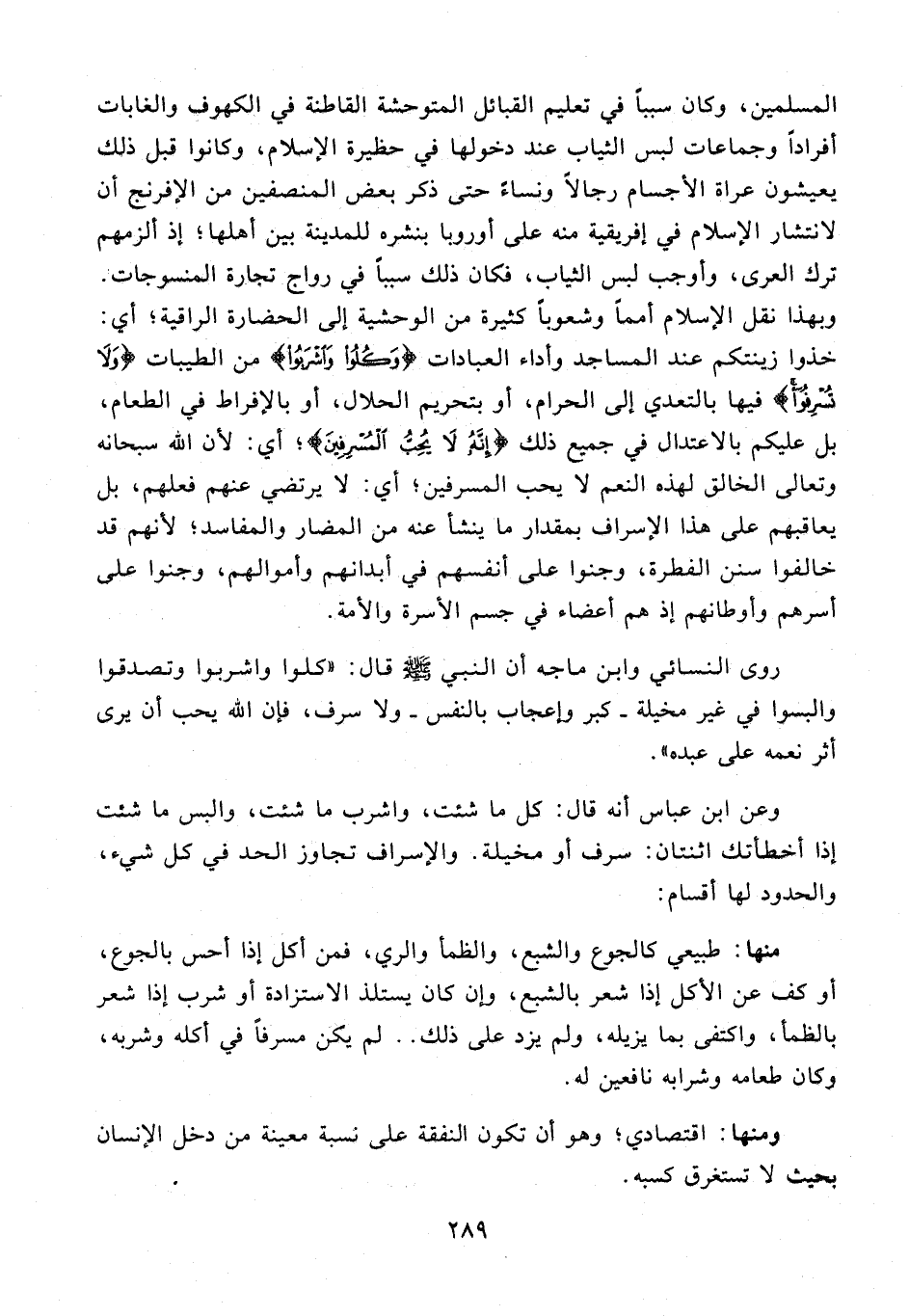 وبهذا نقل الإسلام أمما وشعوبا كثيرة من الوحشية إلى الحضارة الراقية؛ أي: خذوا زينتكم عند المساجد وأداء العبادات {وَكُلُوا وَاشْرَبُوا} من الطيبات {وَلا تُسْرِفُوا} فيها بالتعدي إلى الحرام، أو بتحريم الحلال، أو بالإفراط في الطعام، بل عليكم بالاعتدال في جميع ذلك {إِنَّهُ لا يُحِبُّ الْمُسْرِفِينَ}؛ أي: لأن الله سبحانه وتعالى الخالق لهذه النعم لا يحب المسرفين؛ أي: لا يرتضي عنهم فعلهم، بل يعاقبهم على هذا الإسراف بمقدار ما ينشأ عنه من المضار والمفاسد؛ لأنهم قد خالفوا سنن الفطرة، وجنوا على أنفسهم في أبدانهم وأموالهم، وجنوا على أسرهم وأوطانهم إذ هم أعضاء في جسم الأسرة والأمة.