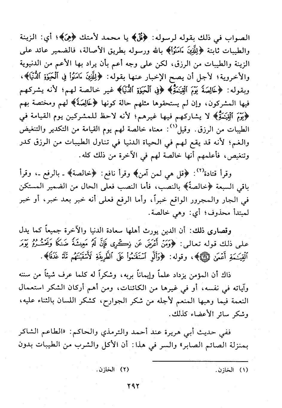 الصواب في ذلك بقوله لرسوله: {قُلْ} يا محمد لأمتك {هِيَ}؛ أي: الزينة والطيبات ثابتة {لِلَّذِينَ آمَنُوا} بالله ورسوله بطريق الأصالة، فالضمير عائد على الزينة والطيبات من الرزق، لكن على وجه أعم بأن يراد بها الأعم من الدنيوية والأخروية؛ لأجل أن يصح الإخبار عنها بقوله: {لِلَّذِينَ آمَنُوا فِي الْحَياةِ الدُّنْيا}، وبقوله: {خالِصَةً يَوْمَ الْقِيامَةِ} {فِي الْحَياةِ الدُّنْيا} غير خالصة لهم؛ لأنه يشركهم فيها المشركون، وإن لم يستحقوها مثلهم حالة كونها {خالِصَةً} لهم ومختصة بهم {يَوْمَ الْقِيامَةِ} لا يشاركهم فيها غيرهم؛ لأنه لا حظ للمشركين يوم القيامة في الطيبات من الرزق. وقيل (¬1): معناه خالصة لهم يوم القيامة من التكدير والتنغيض والغم؛ لأنه قد يقع لهم في الحياة الدنيا في تناول الطيبات من الرزق كدر وتنغيص، فأعلمهم أنها خالصة لهم في الآخرة من ذلك كله.