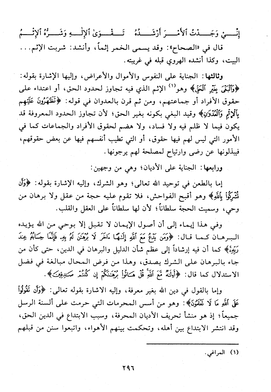 وثالثها: الجناية على النفوس والأموال والأعراض، وإليها الإشارة بقوله: {وَالْبَغْيَ بِغَيْرِ الْحَقِّ} وهو (¬1) الإثم الذي فيه تجاوز لحدود الحق، أو اعتداء على حقوق الأفراد أو جماعتهم، ومن ثم قرن بالعدوان في قوله: {تَظاهَرُونَ عَلَيْهِمْ بِالْإِثْمِ وَالْعُدْوانِ} وقيد البغي بكونه بغير الحق؛ لأن تجاوز الحدود المعروفة قد يكون فيما لا ظلم فيه ولا فساد، ولا هضم لحقوق الأفراد والجماعات كما في الأمور التي ليس لهم فيها حقوق، أو التي تطيب أنفسهم فيها عن بعض حقوقهم، فيبذلونها عن رضى وارتياح لمصلحة لهم يرجونها.
