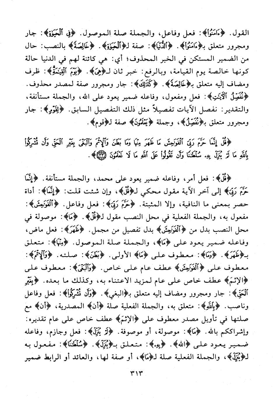 {قُلْ}: فعل أمر، وفاعله ضمير يعود على محمد، والجملة مستأنفة. {إِنَّما حَرَّمَ رَبِّيَ} إلى آخر الآية مقول محكي لـ {قُلْ}، وإن شئت قلت: {إِنَّما}: أداة حصر بمعنى ما النافية، وإلا المثبتة. {حَرَّمَ رَبِّيَ}: فعل وفاعل. {الْفَواحِشَ}: مفعول به، والجملة الفعلية في محل النصب مقول لـ {قُلْ}. {ما}: موصولة في محل النصب بدل من {الْفَواحِشَ} بدل تفصيل من مجمل. {ظَهَرَ}: فعل ماض، وفاعله ضمير يعود على {ما}، والجملة صلة الموصول. {مِنْها}: متعلق بـ {ظَهَرَ}. {وَما}: معطوف على ما الأولى. {بَطَنَ}: صلته. {وَالْإِثْمَ}: معطوف على {الْفَواحِشَ} عطف عام على خاص. {وَالْبَغْيَ}: معطوف على {الْإِثْمَ} عطف خاص على عام لمزيد الاعتناء به، وكذلك ما بعده. {بِغَيْرِ الْحَقِّ}: جار ومجرور ومضاف إليه متعلق بـ {الْبَغْيَ}. {وَأَنْ تُشْرِكُوا}: فعل وفاعل وناصب. {بِاللَّهِ}: متعلق به، والجملة الفعلية صلة {أَنْ} المصدرية، {أَنْ} مع صلتها في تأويل مصدر معطوف على {الْإِثْمَ} عطف خاص على عام تقديره: وإشراككم بالله. {ما}: موصولة، أو موصوفة. {لَمْ يُنَزِّلْ}: فعل وجازم، وفاعله ضمير يعود على {الله}. {بِهِ}: متعلق بـ {يُنَزِّلْ}. {سُلْطانًا}: مفعول به لـ {يُنَزِّلْ}، والجملة الفعلية صلة لـ {ما}، أو صفة لها، والعائد أو الرابط ضمير